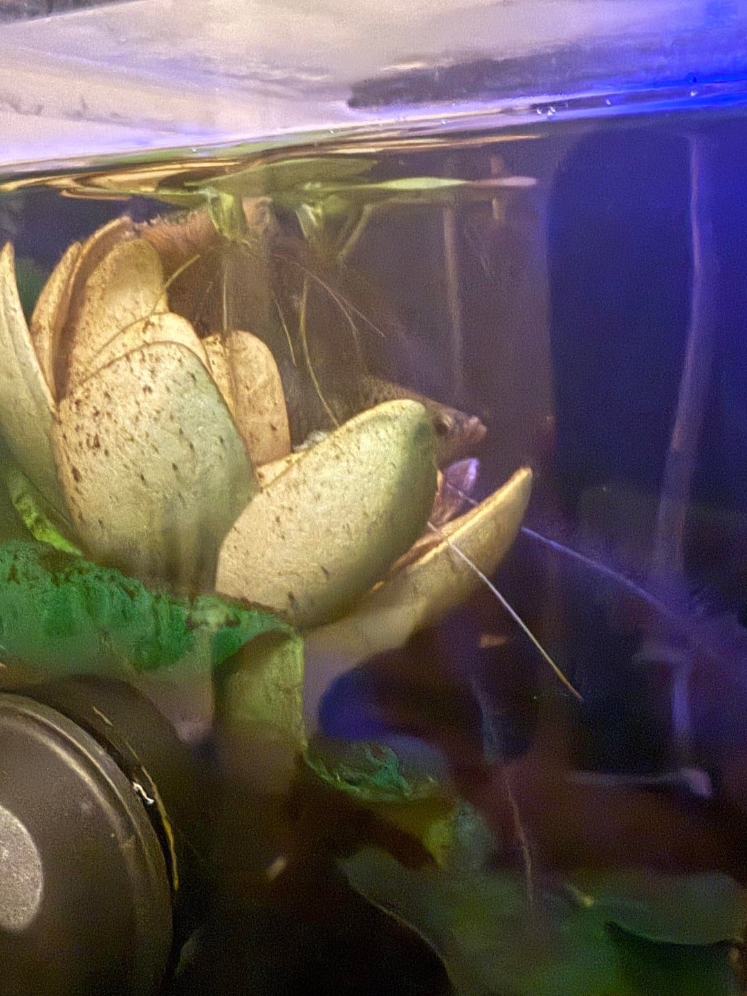 P.S. ignore the brown on that lily pad 😂 I just scrubbed it two days ago, but even with tons of plants that keep algae low everywhere else, that thing is a magnet! she loves it and its her favorite bed, so oh well!