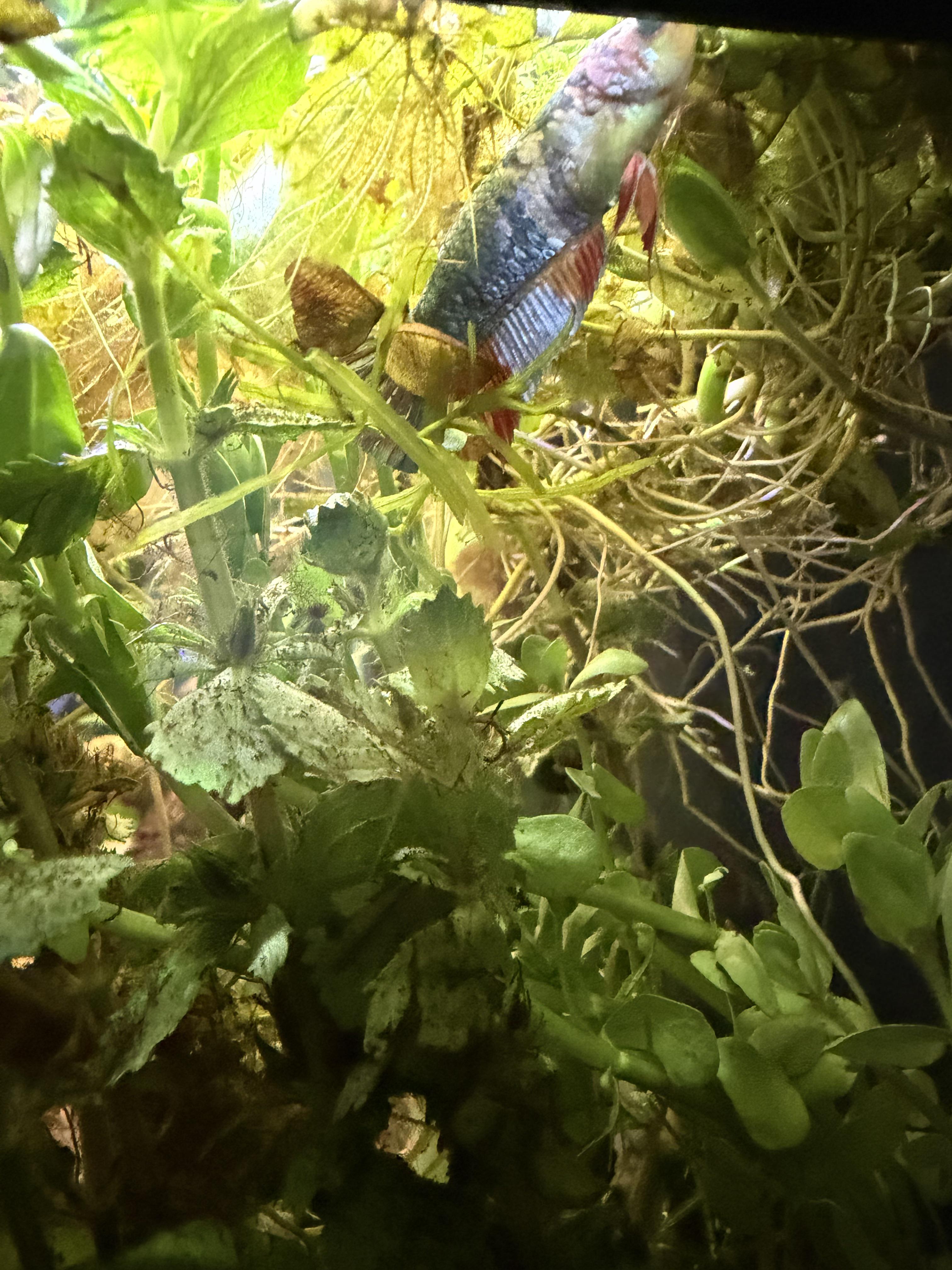 This is my old gal Babs, she has been really struggling for the past month now, the water is at 0 ammonia, 0 nitrites, and 0 nitrates since the tank is pretty planted I added the stems so she could rest when she went to the top recently. She hasn’t eaten in ages, I got her new special hikari vibra bites to see if the movement would entice her, she’s also refusing bug bites, daphnia, and bloodworms. She’s been at the bottom mostly for the past week but today looks like this, is there anything else I can do for her? She was full grown and very colored up when I got her from a high stress situation a little over a year ago, the tank is a planted 20 long with some snails, sawbwa resplendens, and Cory roommates.