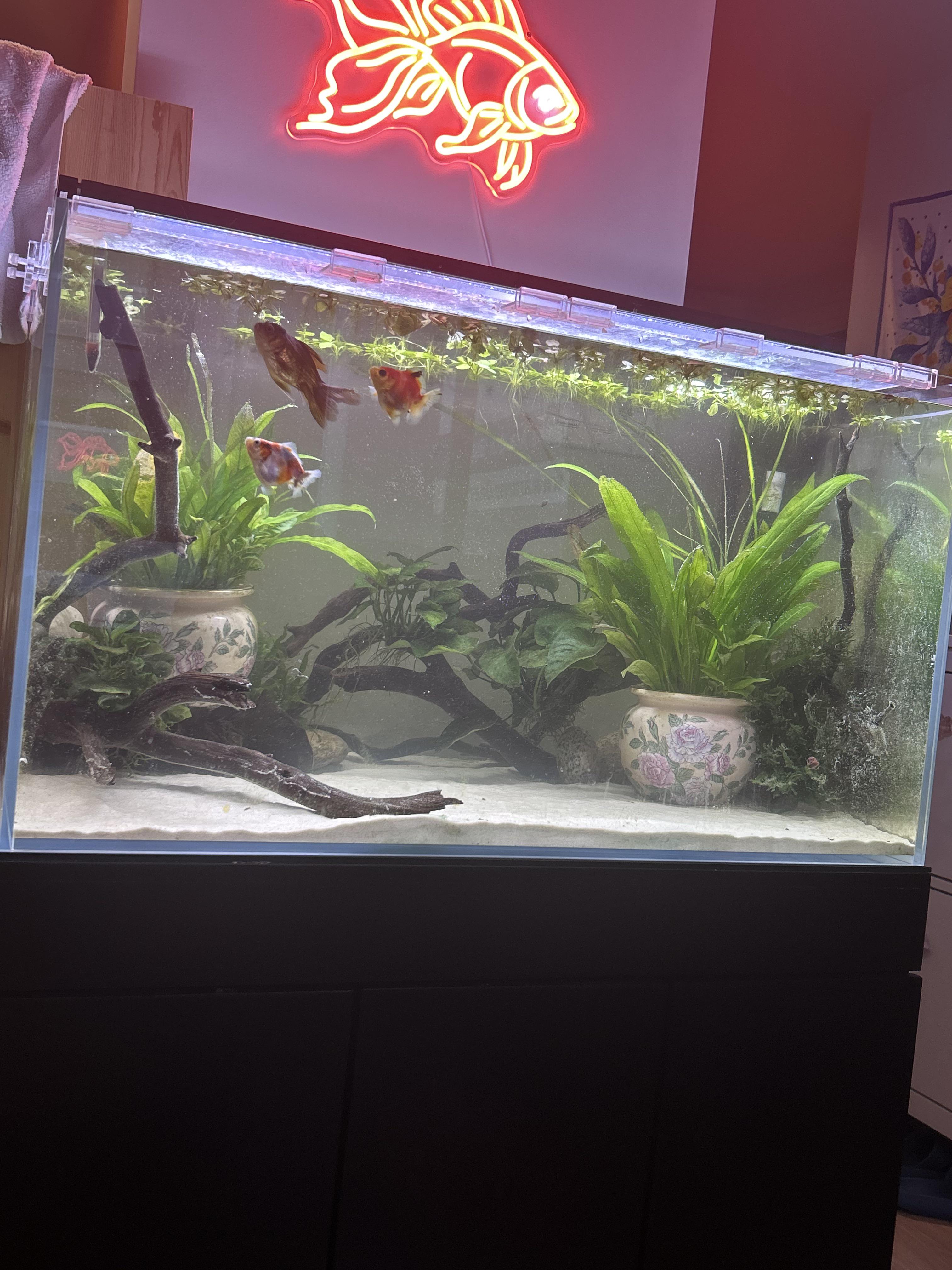 😍the pots are cute. Maybe get some duckweed? Goldies eat it, and the rapid growth is good for nitrates.
