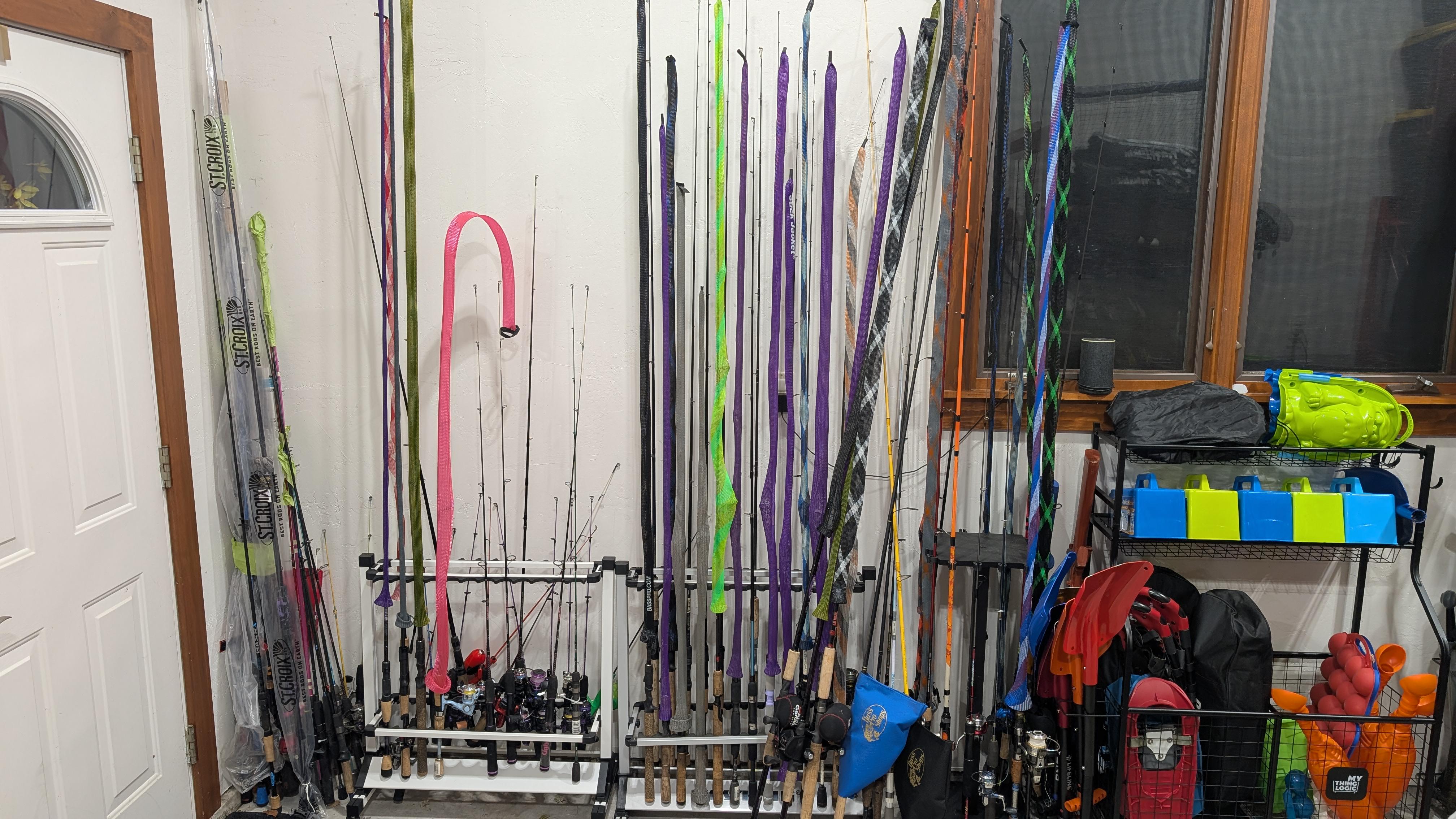 Pic is roughly 60% of our fishing rods. Just moved to a new place, so need some rod storage ideas. I have a wife and 6 kids and we fish bass, musky, panfish, walleye, etc, so we each need access to multiple rods at a time. Ceiling mount is out of the question, since we have 12' ceilings. We previously used Cobra garage door panel horizontal holders, but my new garage has integrated insulation and they won't fit. I don't like the floor mounted holders we have–one little bump and all of the rods fall over. Thoughts?