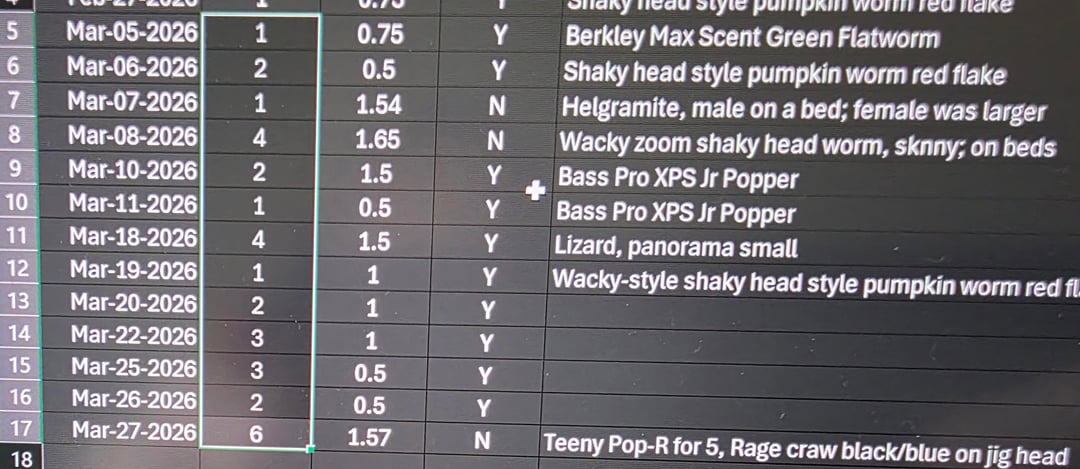 This March, I have fished 13 days and already caught 32 fish, about 2.5 per outing. not every outing was that long, but a few were 3 hours of fishing.