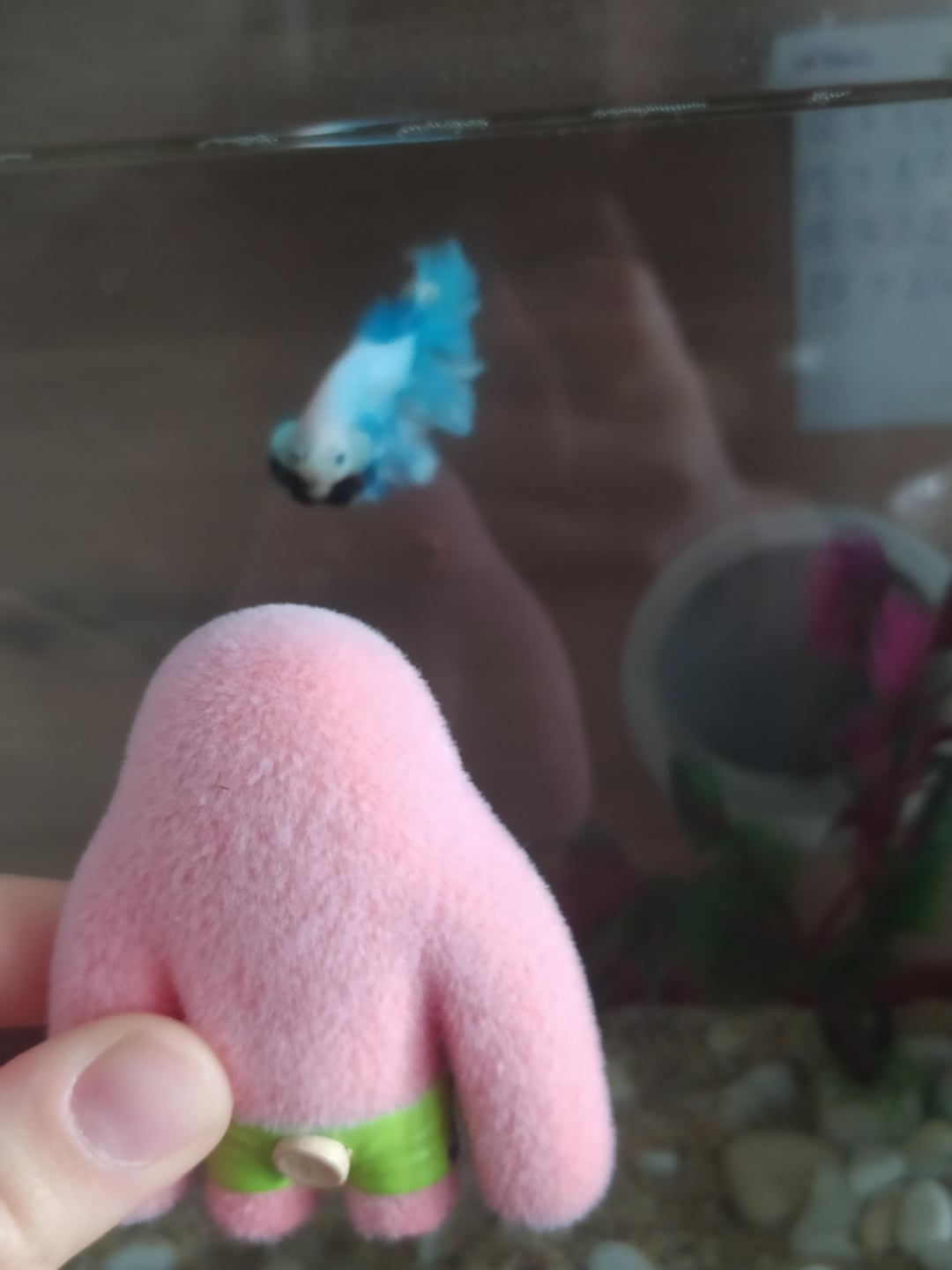Whenever I show him this ugly figure of Patrick,he gets all defensive and puffs up his fins. Does anyone know why he acts like that? https://www.reddit.com/gallery/1s6xzo0 Posted by watfrark