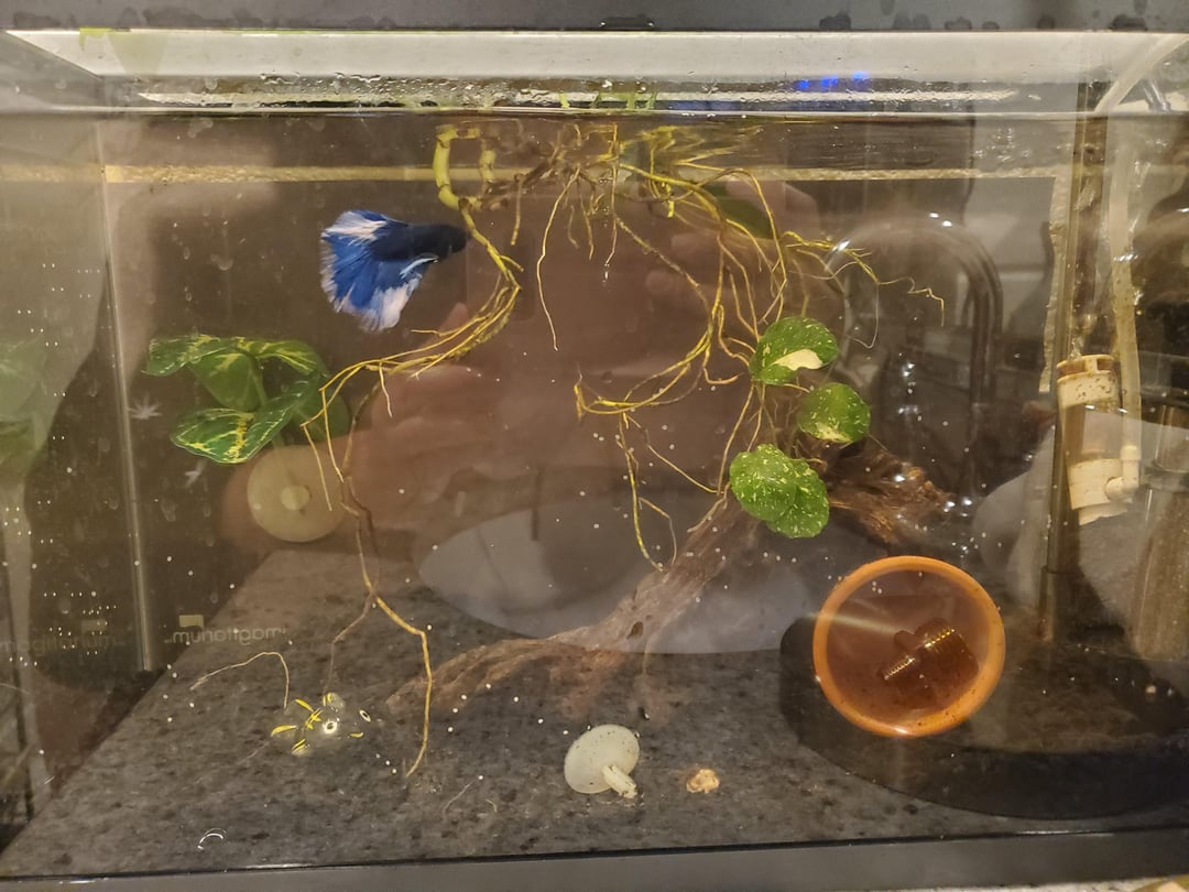 Also, what was I doing wrong that this happened in the first place? Ik it is usually caused due to stress, but he is in a quiet place of the house, no reflections, plenty of hiding places wunderkind driftwood, 8 hours of low lighting a day, tannins from the driftwood as well. I did add a new piece of driftwood I got from another betta tank a few days before I started noticing symptoms, and have also been doing 30% water changes on the other dudes tank, raising the temp a bit, but the other guy (Virgo) seems perfectly healthy with 0 signs of Ich or anything else…so I don't imagine it would have come from his tank?