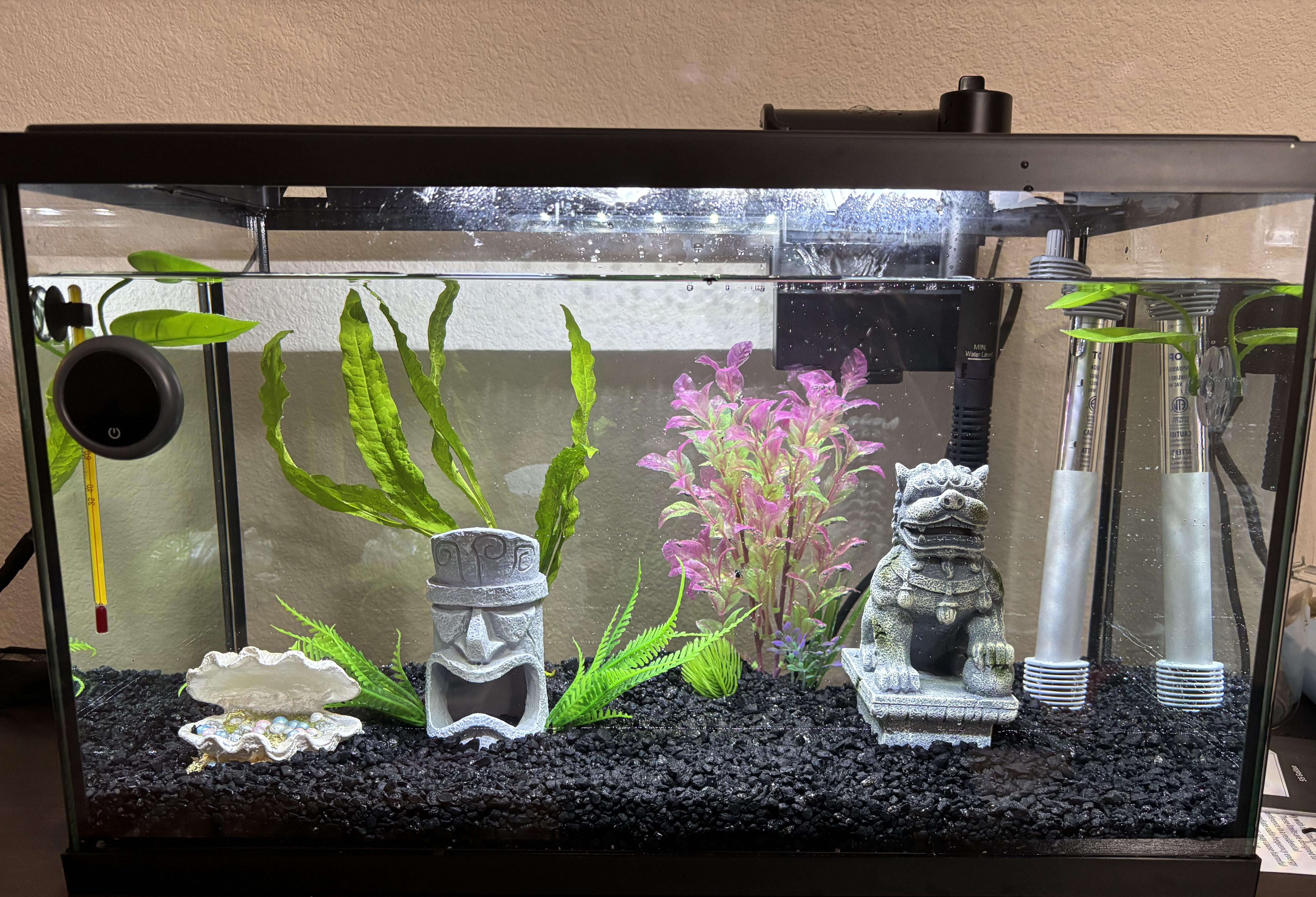 I’ve tried to do a lot of research in the last week but am clearly no where near being an expert. This is the current setup of my tank while I cycle it. Please let me know if there’s anything I should adjust or remove or add. I got the topfin 10gallon tank kit for now as a beginner. I also have been boiling driftwood for the past two hours but not knowing if I should add it.