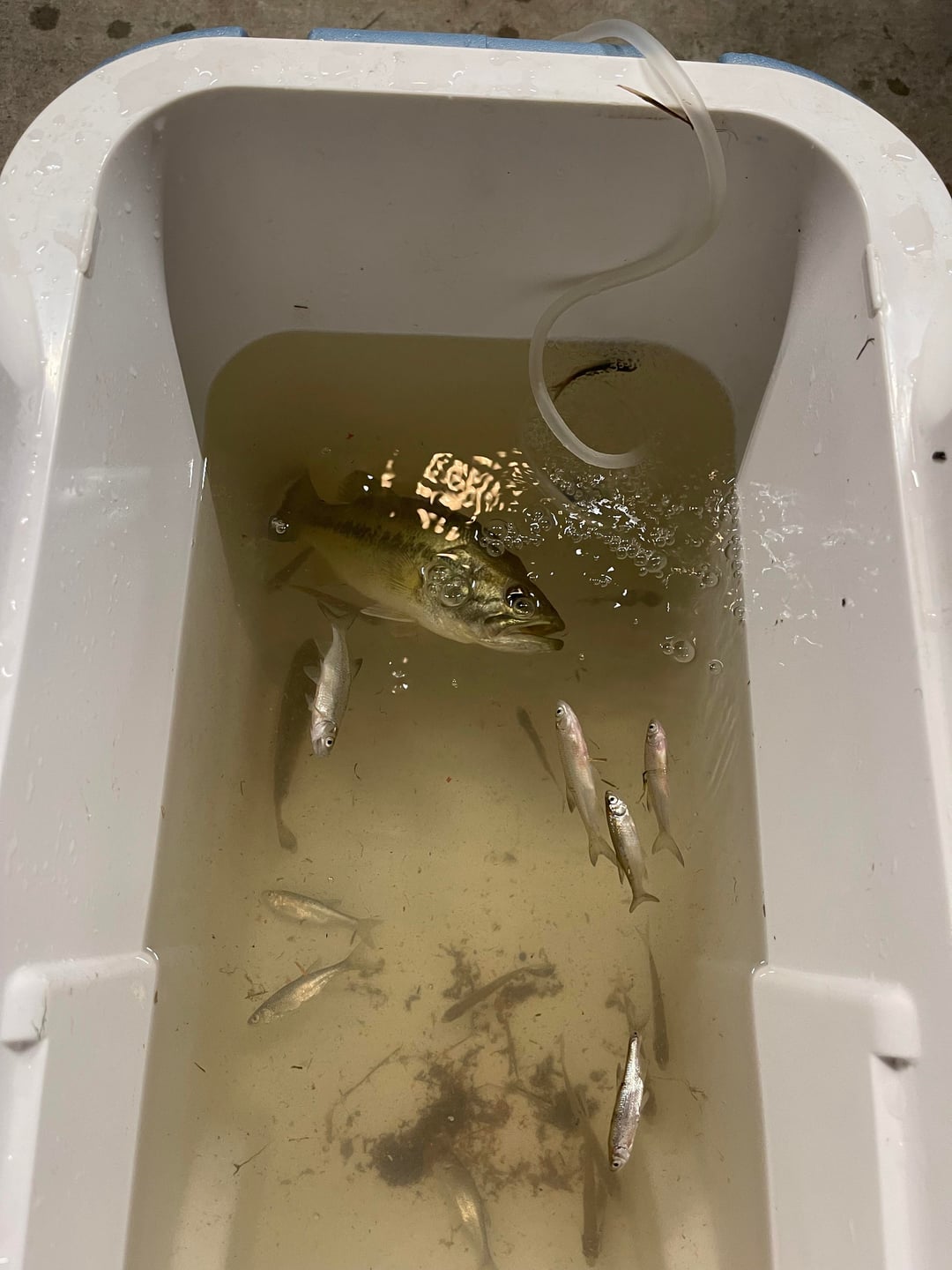 Took the bass home, transferred it to my cooler with the air pump, then went to work. I come 5.5 hours later, and the bass is still strong. No problem staying upright, and was reacting to my presents. Got some needle nose and tried again to remove the hook. Still couldn’t get it. My dad then came out and got the extra long needle nose, and with me holding the fish, he very roughly pulled the hook out, and not very gently at all.