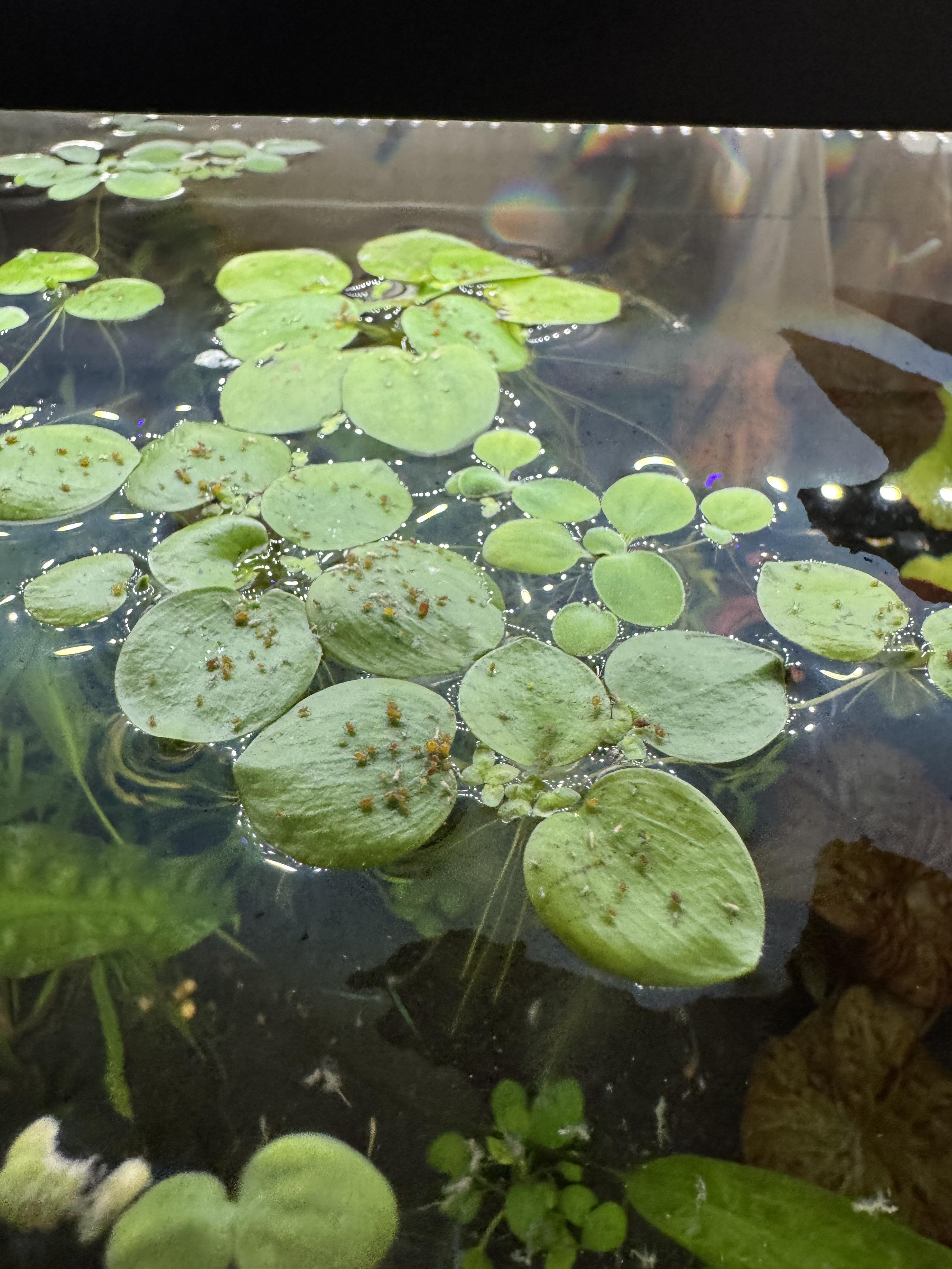 Turns out they loooovvve frog bit, as you can see in the pic. And funnily enough, they don’t really seem to affect the growth much in a negative way. So the frog bit still looks really nice and you only see them when going up close.