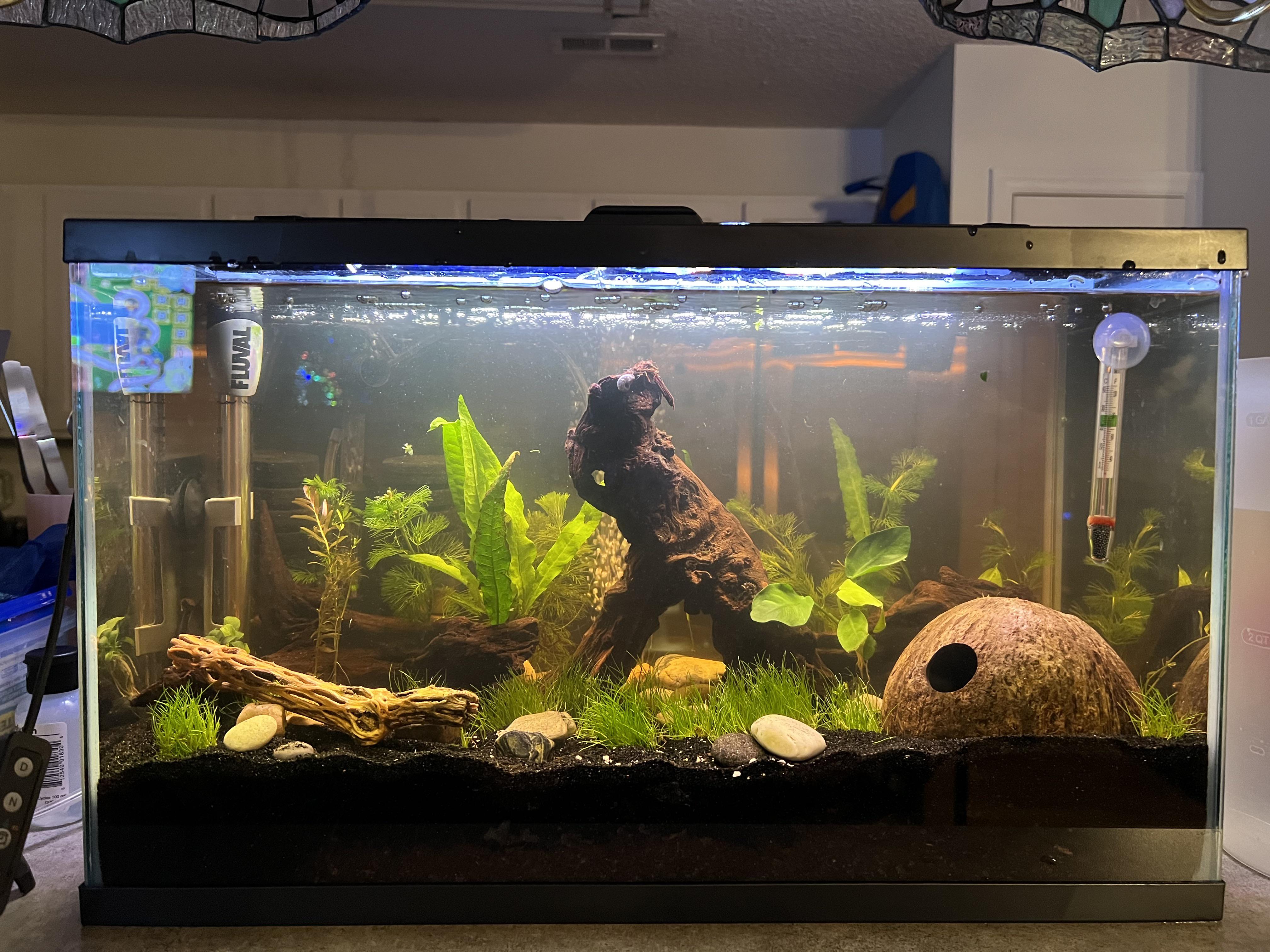 I have 1 inch of organic topsoil topped with 1.5 inches of sand, plus several pieces of driftwood, cholla wood, a coconut hut, and some rocks. I have a bunch of java fern and multiple anubias, plus nano petite anubias. I’ve planted some dwarf har grass up front and have multiple cabomba in the back, plus a rosette sword. There is some rotala as well that’s been in my tank since the start, but it’s not looking great. Also have a crypt that arrived yesterday, but it was completely melted. Root system looked good though so hopefully she’ll make a reappearance!