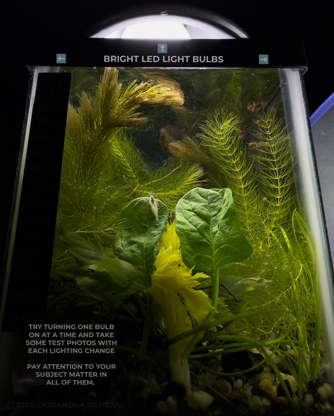 I typically use three bright LED daylight bulbs (the heat from regular lightbulbs will toast your critters, so LED only!) in those metal clamp lights and arrange them around the tank (right, left, top). Play with how your photos look with just one light on. Try a different light and check your results. Then try combos, eventually turning all three on. Figure out which lighting setup you prefer for the image(s) you are currently trying to take.