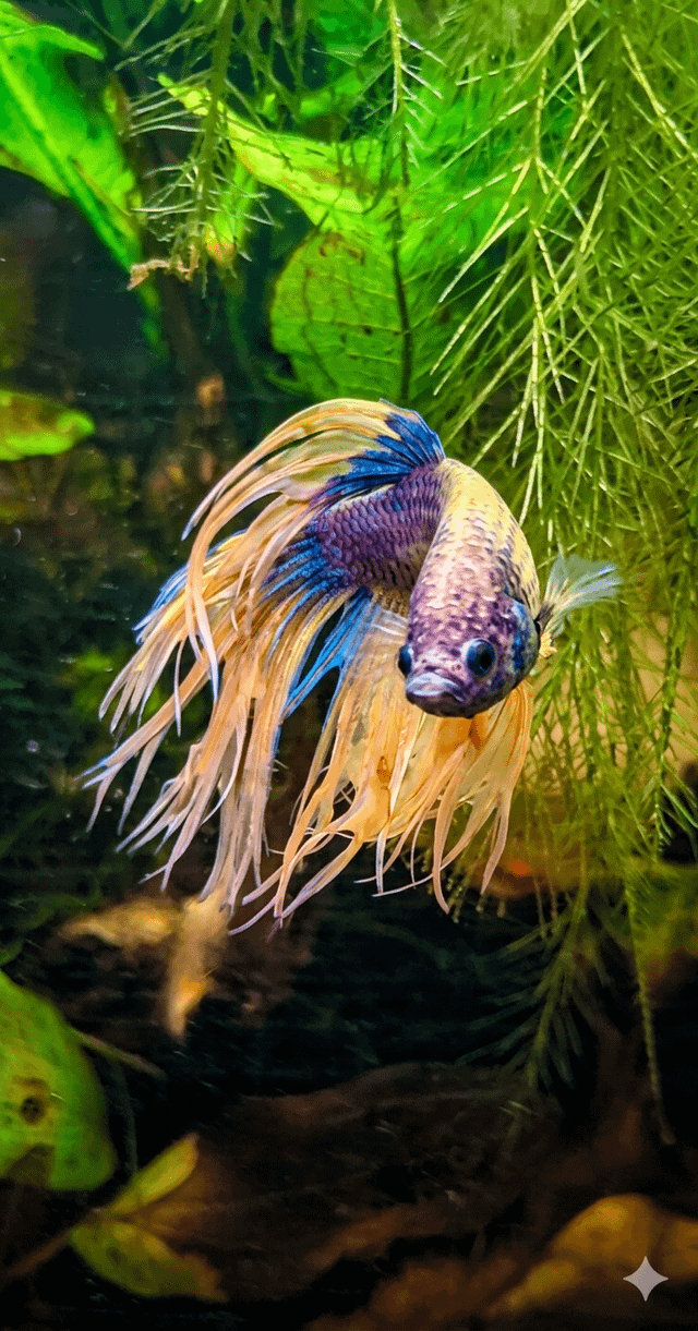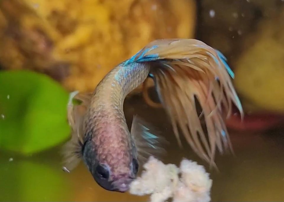 I lost the photo I had of my betta unfortunately. But he was light purple, pink, yellow, and blue. The tail was yellow fading into blue.