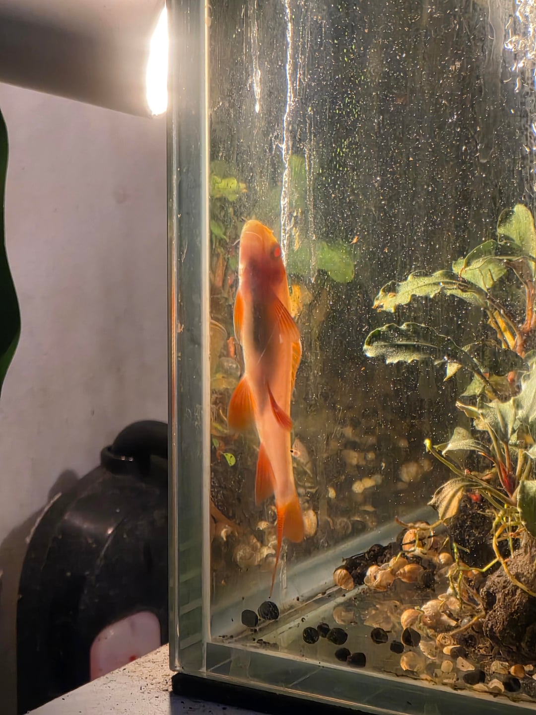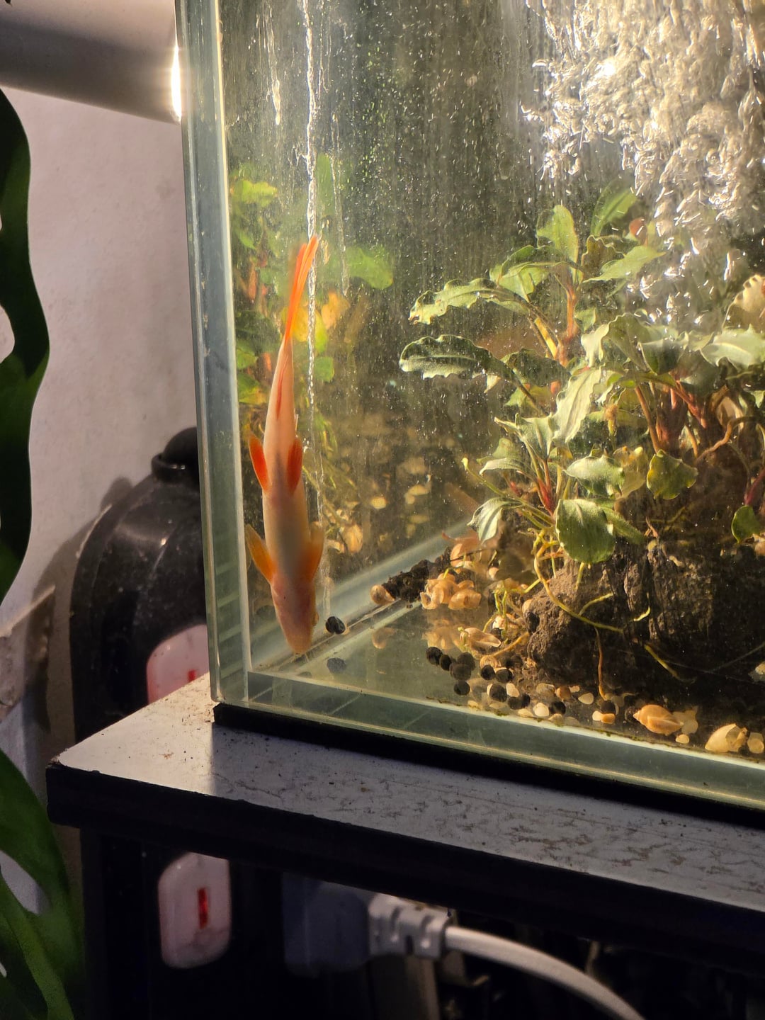 Hello!! I'm not too familiar with this subreddit (and reddit as a whole) but was hoping I could get some advice on one of my albino rainbow sharks. For some reason, she seems to have a habit of going to the same corner of the tank and just… standing there. Literally. Sometimes she's facing the sky (kinda like she really is standing lol) but she's mostly just vertical and upside down (like in the 2nd pic), and kinda just chillin there. She doesn't spend all her time in her corner and is otherwise a perfectly normal shark, but she stands there often enough for me to notice (and worry).