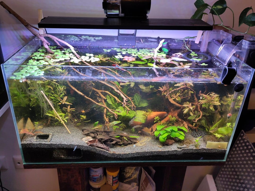 Every other day I let the HOB run faster for a couple hours, to create a stronger flow to give enrichment to the critters who enjoy it. King Pete loves to swim in the higher currents as well! I call it treadmill time. When he tires he retreats to the back of the tank, where wood & plants block the flow and watches his subjects frolic.