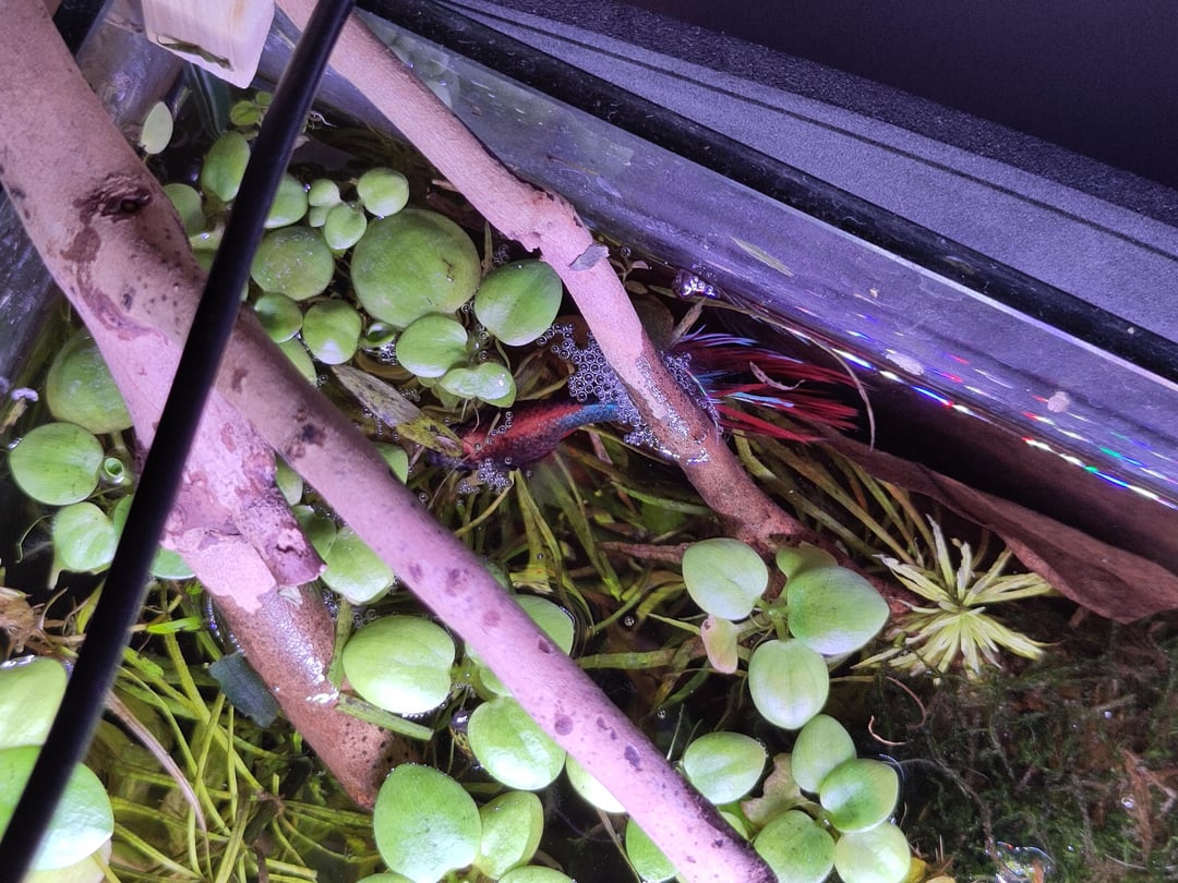 I had and still have a 30L Cube ready, in case I noticed that the busy aquarium stresses him out. He has only flared once since the introduction, when I was feeding everyone with Daphnes and he decided he deserves *all of them*. He likes to spend his time in the quite left corner ( I specifically set it up to have lots of tall plants so he can just chill there) and has set up his first bubble nest there. No one goes there, so he doesn't need to protect it. He patrols the upper left side of the tank, the one with more plants, and seems to have made that his immediate territory. Cory's & Amanos stay to the botto and Blue Eyes & Otos prefer the front & right side where the waterfall gives plenty of movement and a bit of current. So Long Pete has about half of the tank completely for himself (minus shrimp who are allowed), where he can retreat to his royal chambers anytime he wants to.