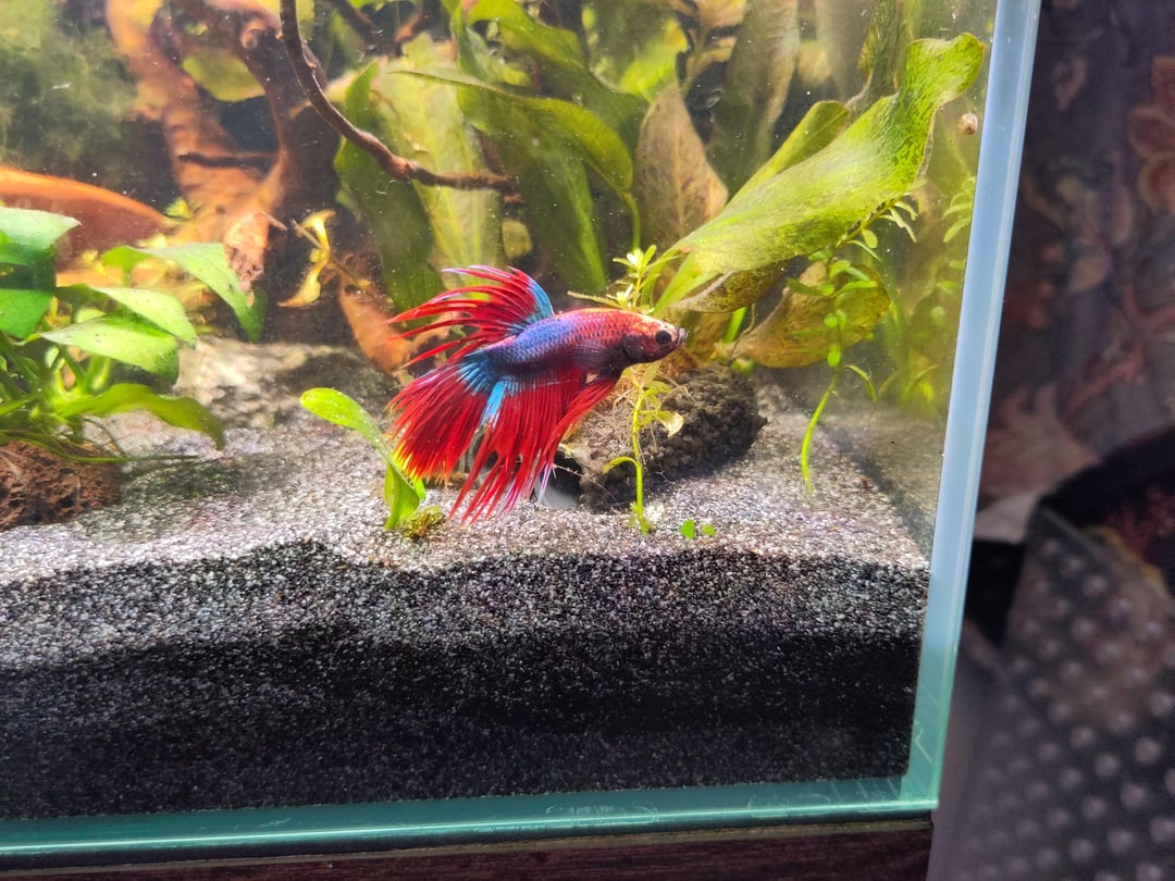After talking to the owner, I knew I could build something grand for him. Being a Crowntail, he can swim better than Halfmoons, so a 60L Tank was a possibility for it. So I set out to create a perfect Fishdom for him: Good heater, a lot of filtration (HOB rated for up to 100L with Sponge on inlet and mini Seraprox as filter material to maximize biofiltration), lots of different plants, wood and rock to create seperations and hiding places. The front part of the tank is open, while the back is covered in a jungle. The HOB has a waterfall and runs down the open front part.