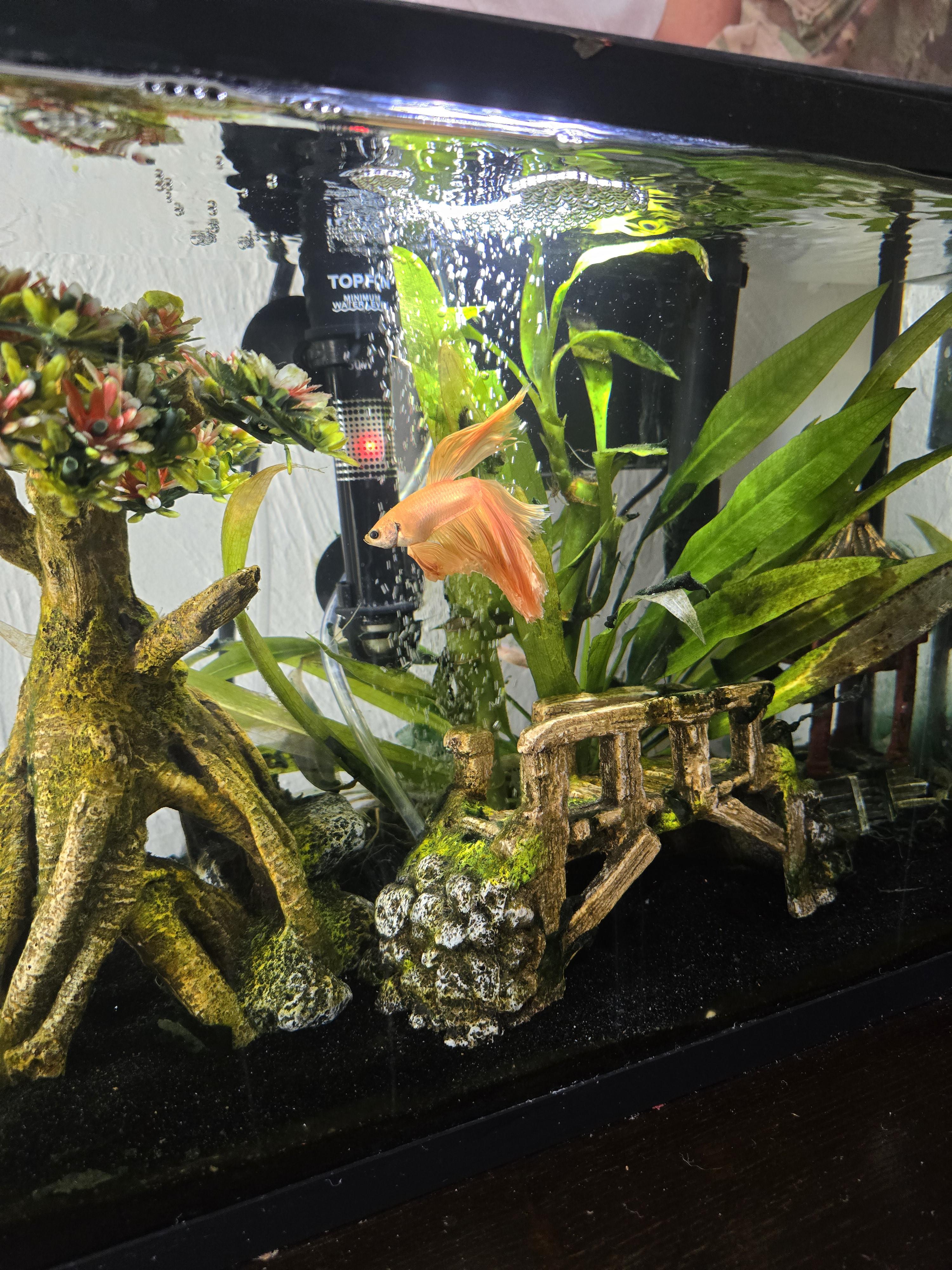 hey guys. I'm just curious about my boys color. when i got him his fins were thinner, more frail and he was more like a pale yellow with some black spots. now, he's really fanned out and turned into this solid orange/yellow metallic color. I'm only curious because I've never come across this color any other time before. thoughts?