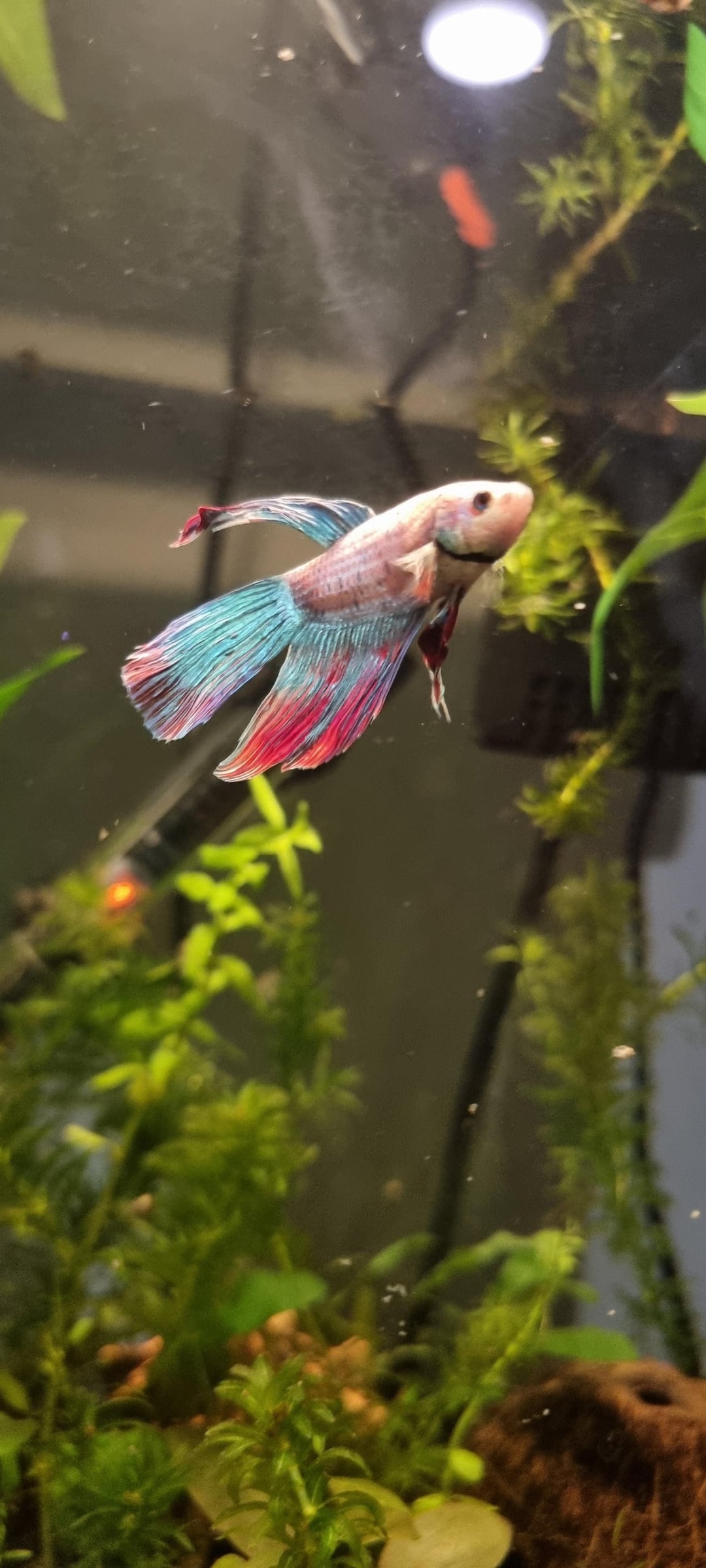 hi this is my veil tail betta fin and we've had him for a few months now maybe 3/4 and I've been thinking all this time that he looks quite different to a lot of veiltails I see online and just wondering is it normal for his fins to look like this or could there be something wrong? parameters have been stable for a long time and he has all live plants etc other than the resting spots at the top and ofc the two logs aren't real but ye just wanted to know what some of u guys think. this is my first fish and he lives with 6 pygmy, a few snails and shrimp