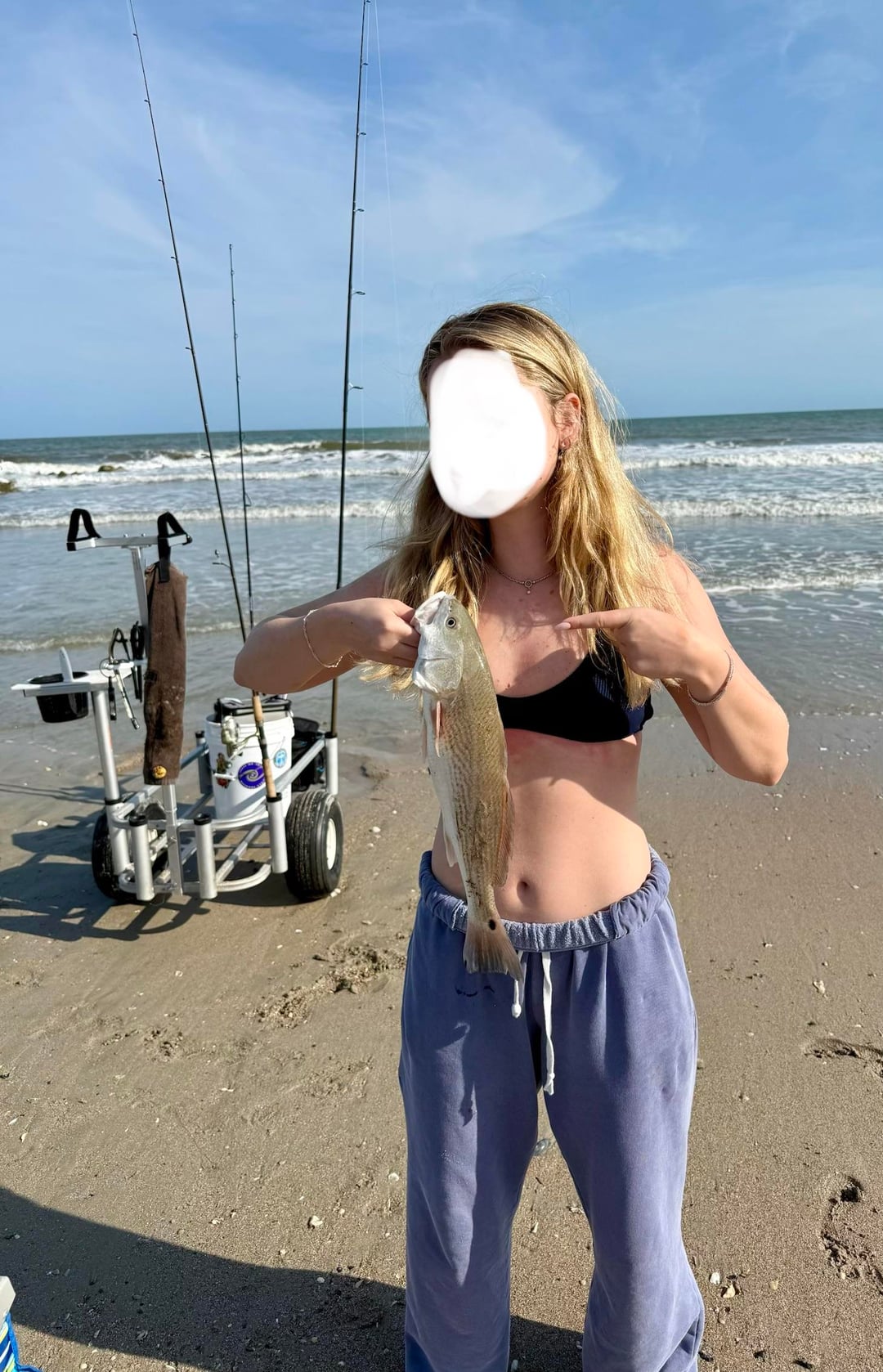 So I made my first cast up close against one of the jetties. Using my 7ft St Croix Mojo Surf rod with a 4500 Penn Slammer 3 now. Lightened up the drag & stuck it in the surf fishing cart. Sat my butt down & who comes up behind me with her chair – my daughter who I’ve barely seen since we left 😁👍🏻 Not 2 min later got a nice bump then a beautiful bend in that rod & the sound of line being peeled off. She sees it immediately and I actually have to tell her TWICE to grab it. After a nice tussle she landed her first puppy drum in the surf – very proud papa moment. 10 min later she was gathering shells – I guess she just had to show me how it’s done & walk away 😂