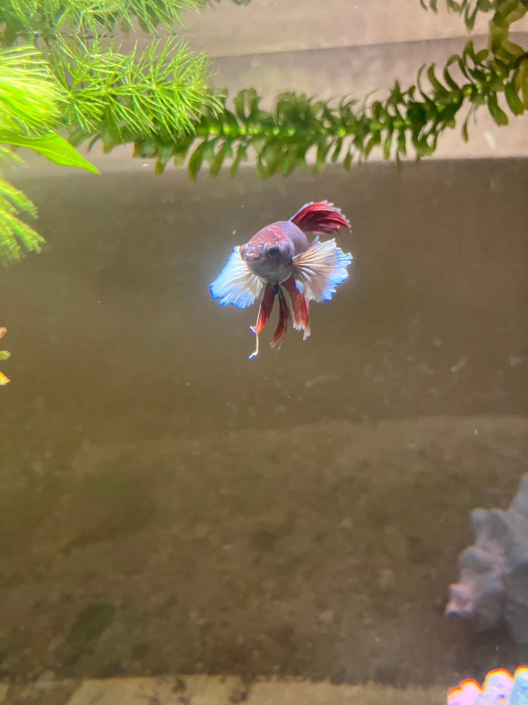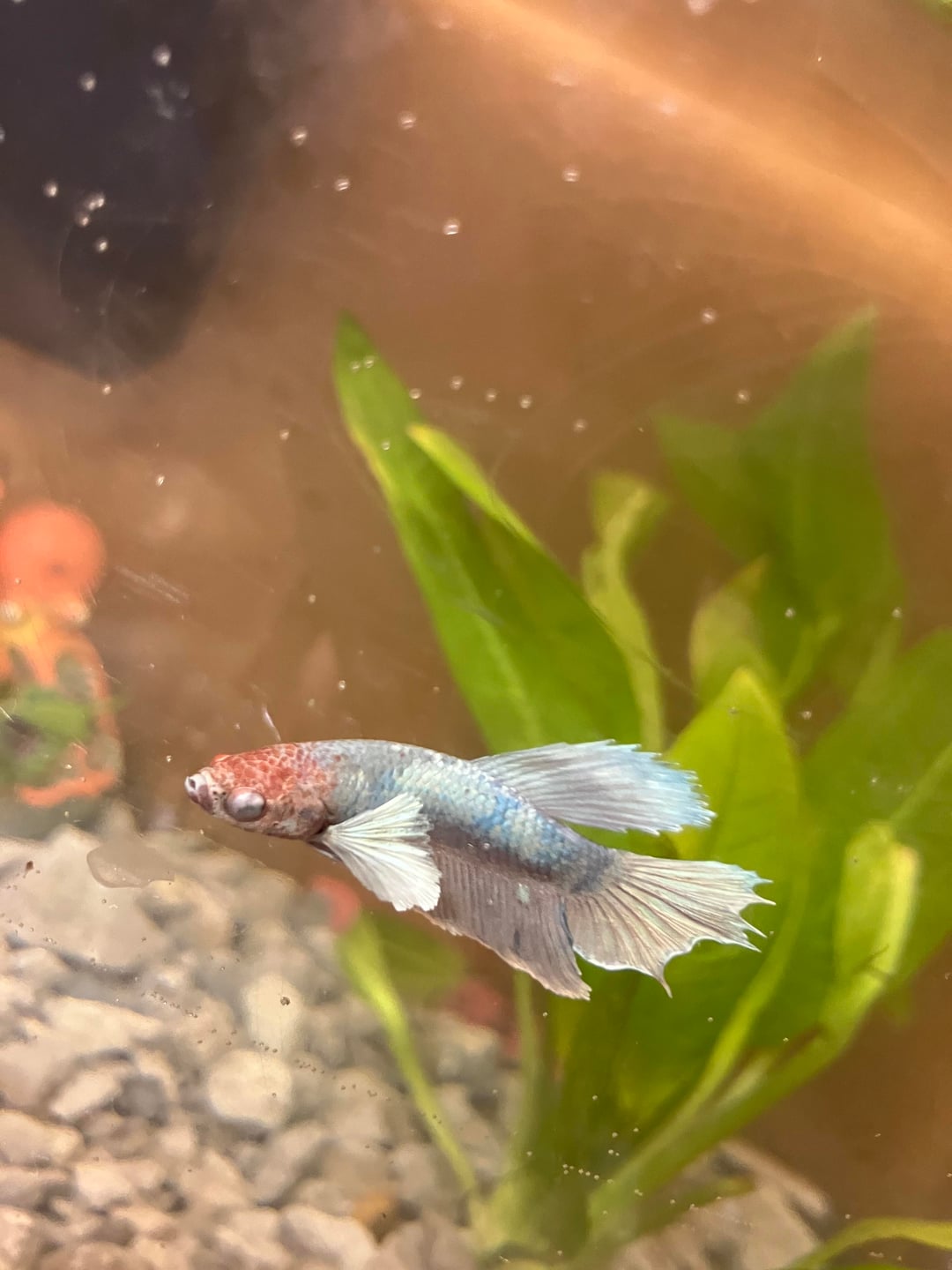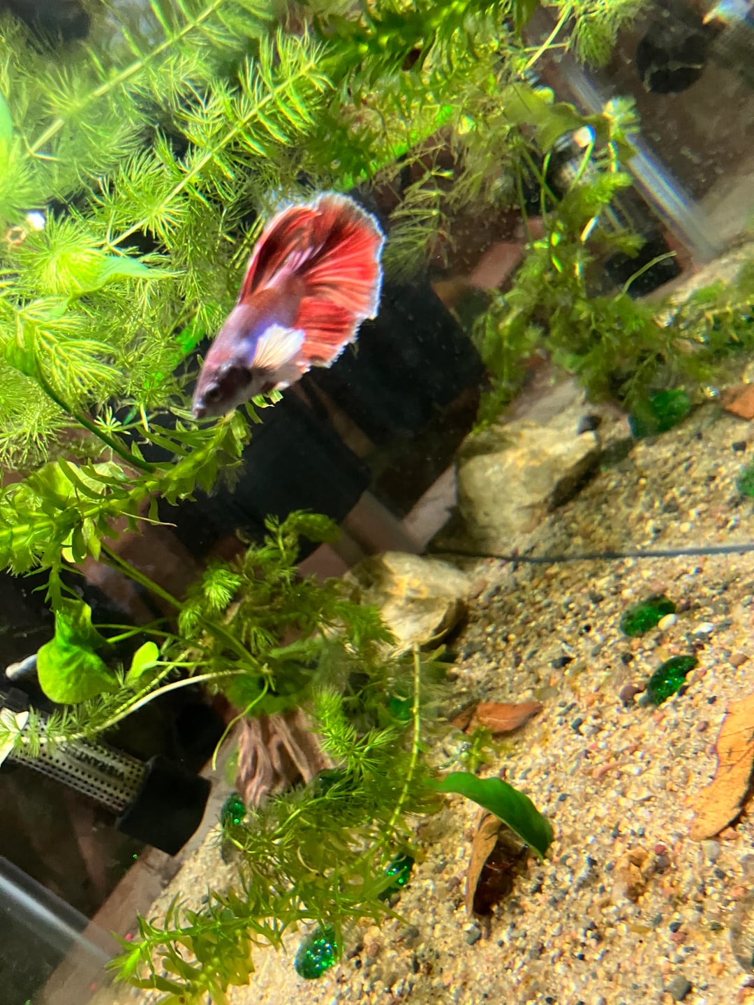 i got a new fish today, wasn’t planning on it but when i saw hed been their so long and seemingly blind in one eye, and chewed off his fins i took him home anyway because i didn’t want him to pass knowing i could’ve helped. i have a spare tank that’s almoast cycled for him, for the time being he’s staying in a 3 gal with his plants and a filter on my desk. i belive he may be a sibling to another betta in bad condition i got about 3 weeks prior, barbosa. barbosa was basically dead when i got him, but he made a (almoast) full recovery and is now one of my sweetest, and social bettas. he stays with my elderly ramshorn snail lilac, mystery snail cosmic, 6 ghost shrimp ( i call them all swimothy and swimone cuz i can’t tell who is who.) and two baby guppies barbie and barbara. the shrimp and guppies were attempts to get him to eat, but he befriended/parented them instead so now they live together. he had the babies since they were 4 hours old and they’re finally developing colour 🥹 i think they might be siblings because they look around the same age, and have been their about the same amount of time, they look just like eachother in the face aswell but i’ll never know. i tested the water he came in, and it was horrendous. first pic is him, other two are barbosa.