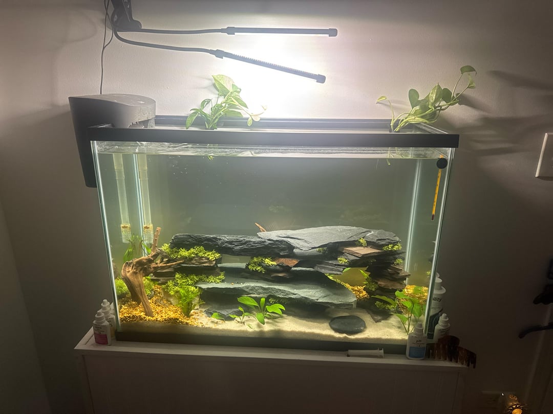 Finally completely cycled this 29 gallon aquarium! The rock structure was completely built by hand by my sister 💕 If anyone has any ideas to cover the top area, i’d really appreciate it!