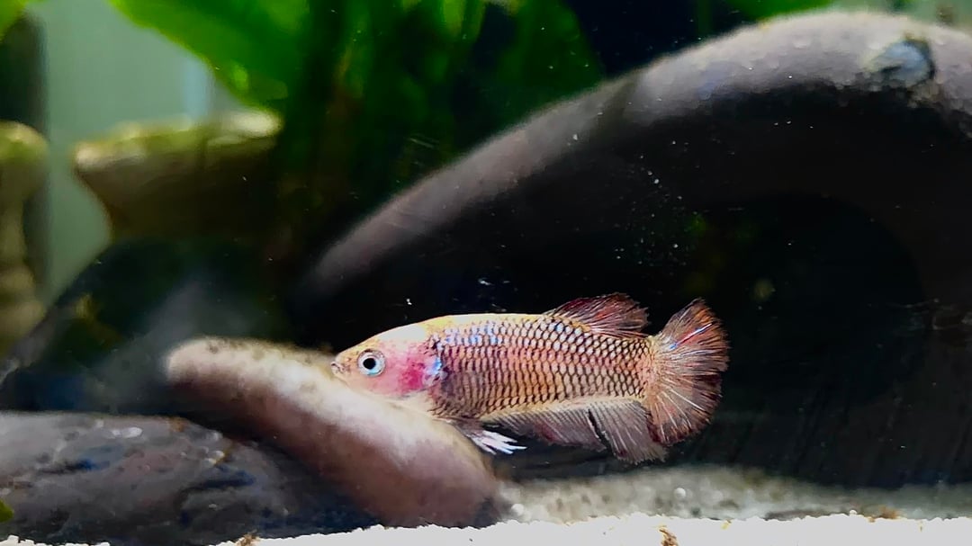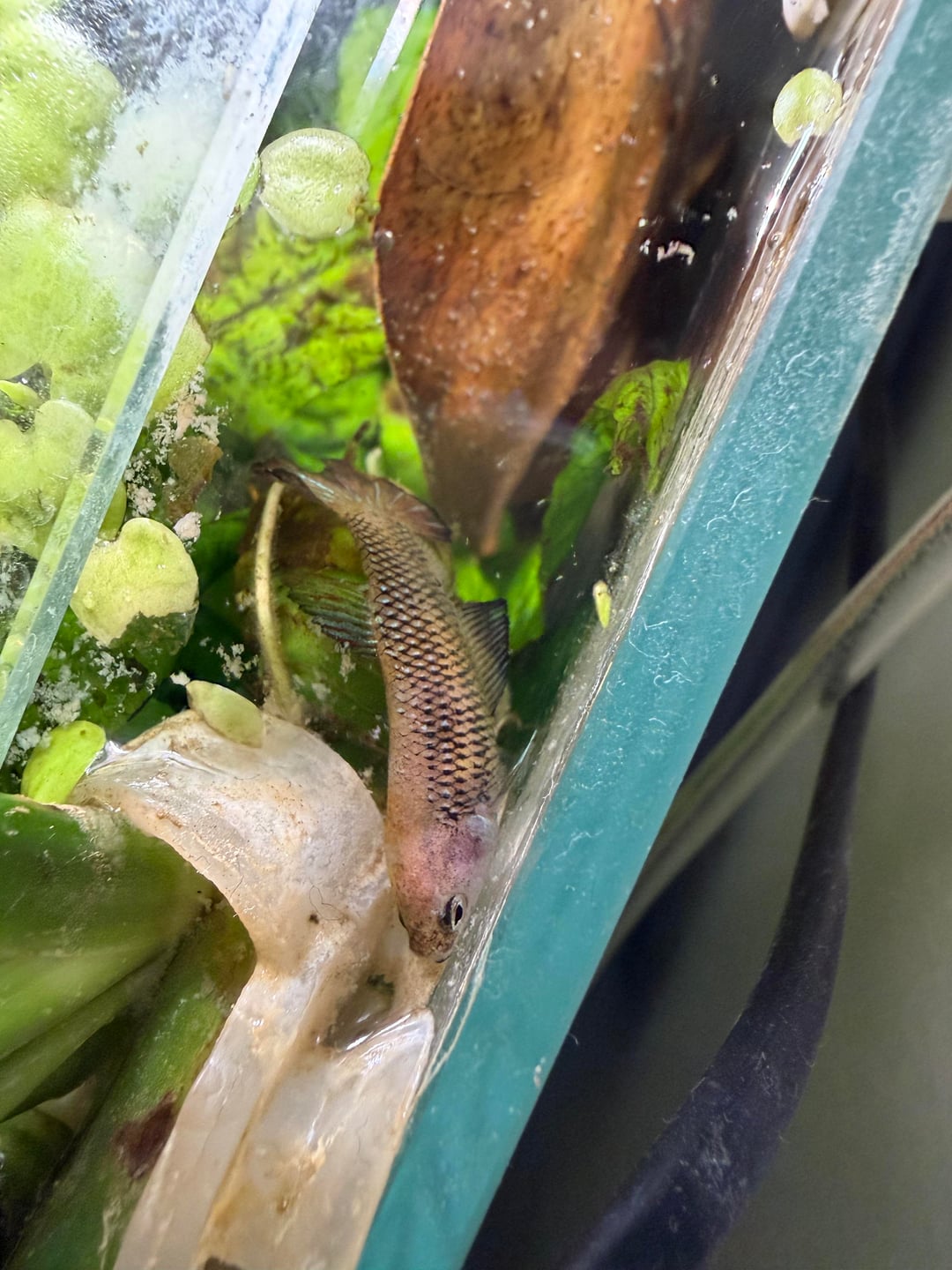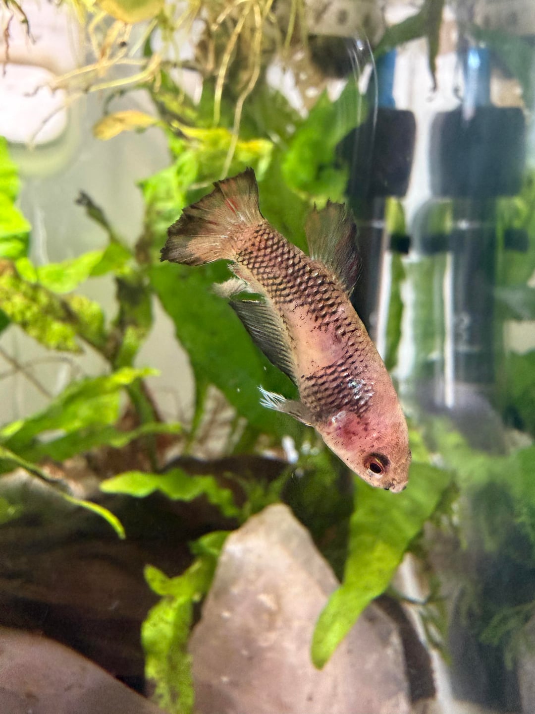 Her tank is a 4 gallon cube, filter,heater,planted, parameters are fine since i’ve been doing constant water changes (gh and kh are a bit high), no tankmates, cycled.