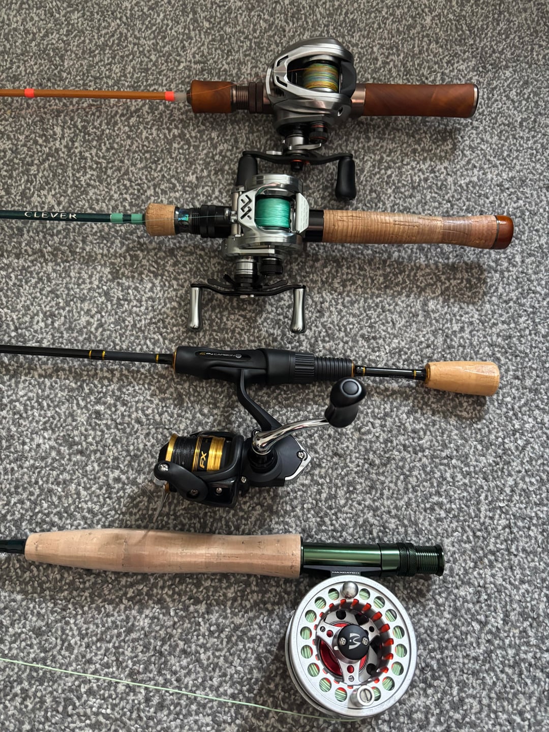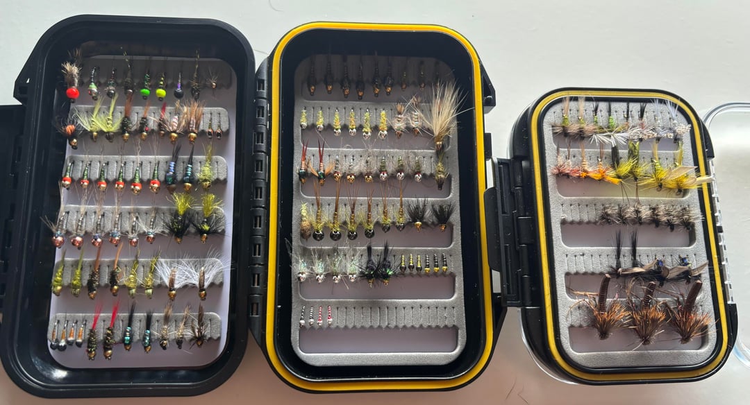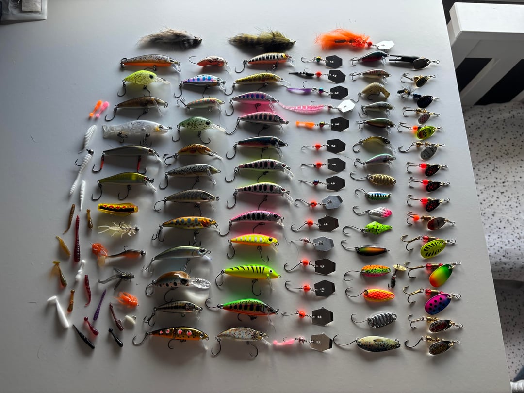 A large mix of lures, mostly Aliexpress copies that work great & some rapalas, sakuras, salmos & custom mades. Lots of different flies, PTN, hares ears etc