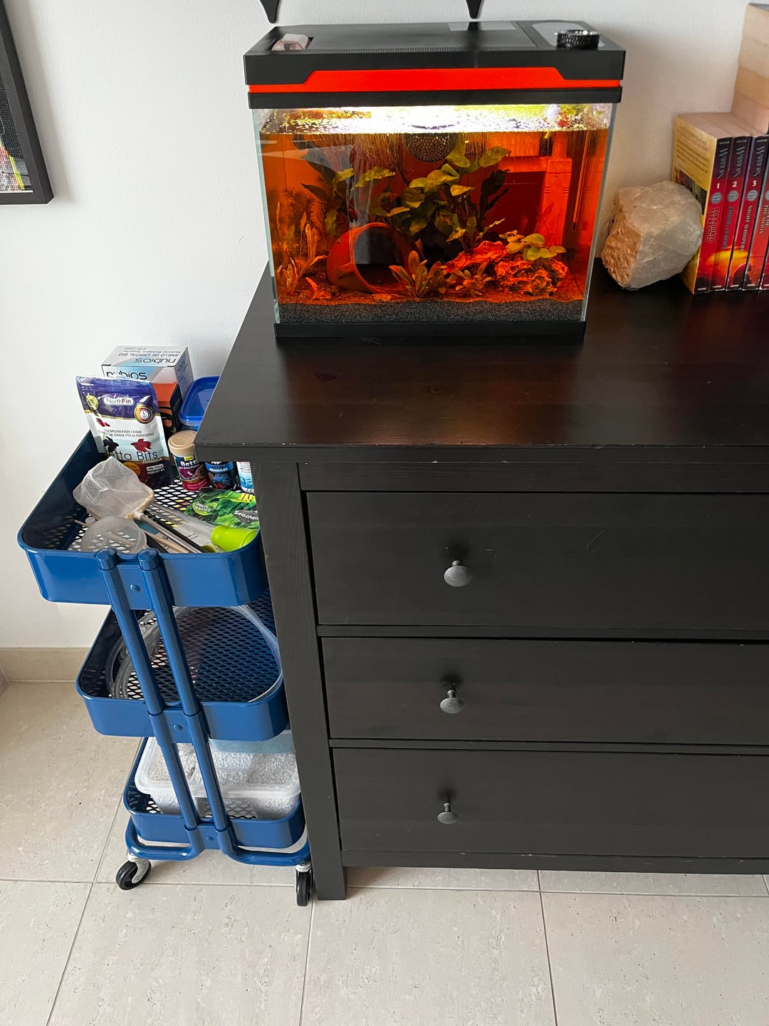 First picture shows the area around the tank. Yes I’ve checked under and behind everything. Yes I’ve checked that cart, the only reason it looks organised is because I cleaned it up after I checked everything.