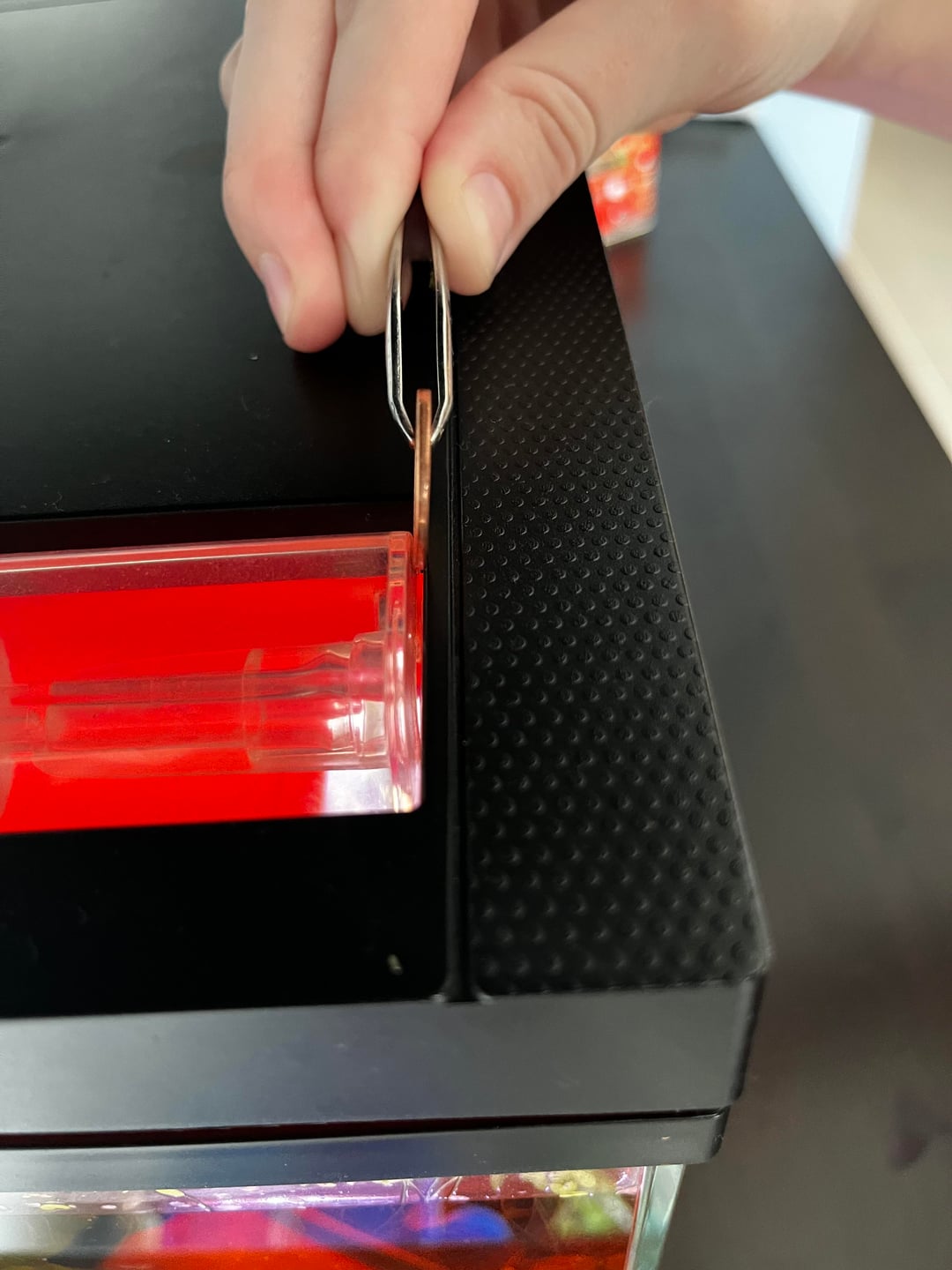 Last 2 pics is the only hole in the entire tank that I can see. I don’t use the automatic feeder and have pulled it off the magnet and turned it around in order to keep that gap as small as possible. With a penny for scale of how thin that gap is, the penny can’t even get in the slot unless I push the feeder.