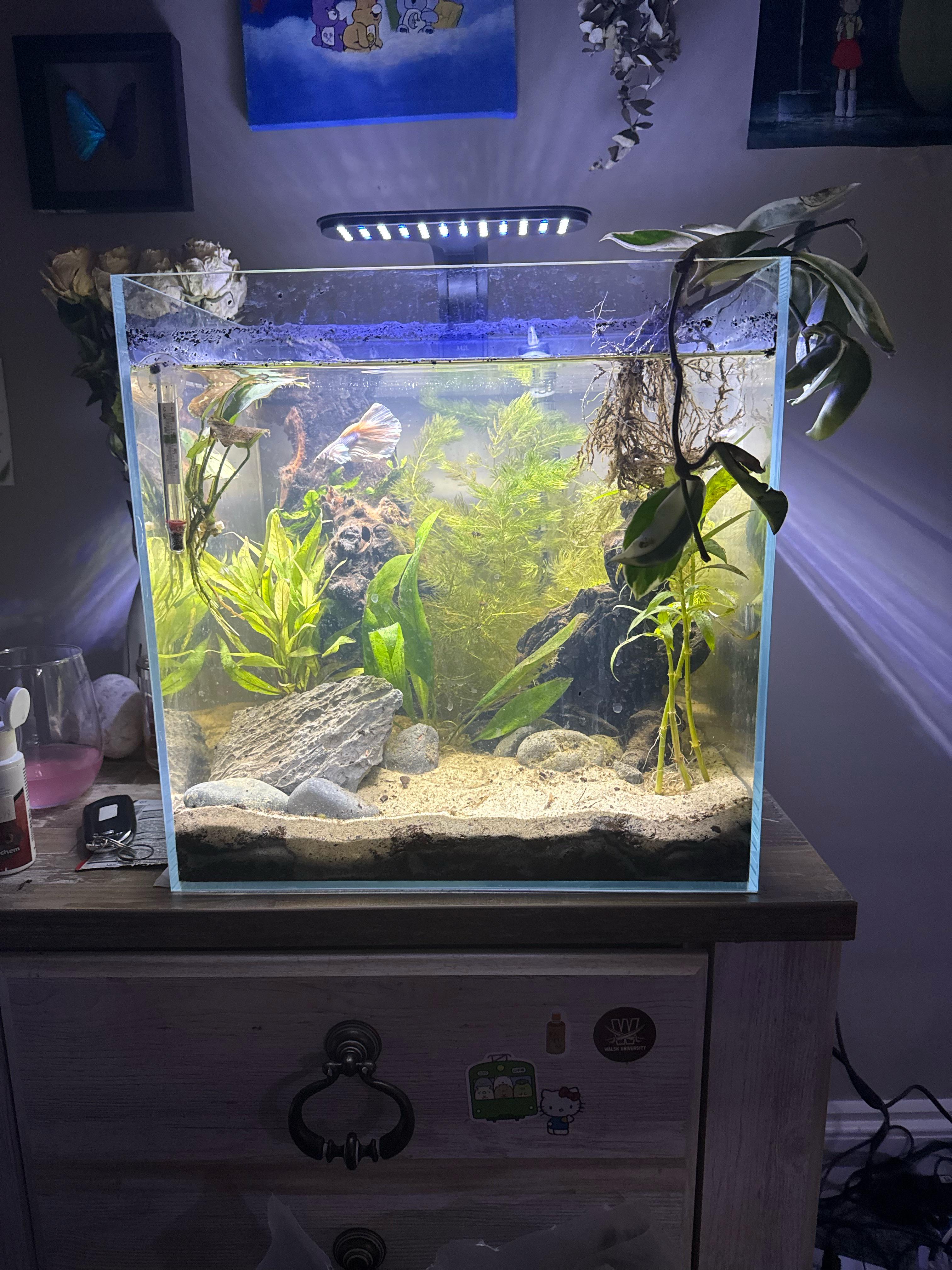 I’ve upgraded numerous tanks (only had this issue with males …) and have had a handful who did not like the larger tank even after a month of time to settle. Back in their little tank and they are happy babies. Sometimes they like smaller, some bigger, but yes.. cube is not a great water layout for a betta. Length vs height always when ya can. But I’m sure he’s depressed in a larger tank/feels more exposed regardless of cover as it’s a size thing not cover issue for this fella.
