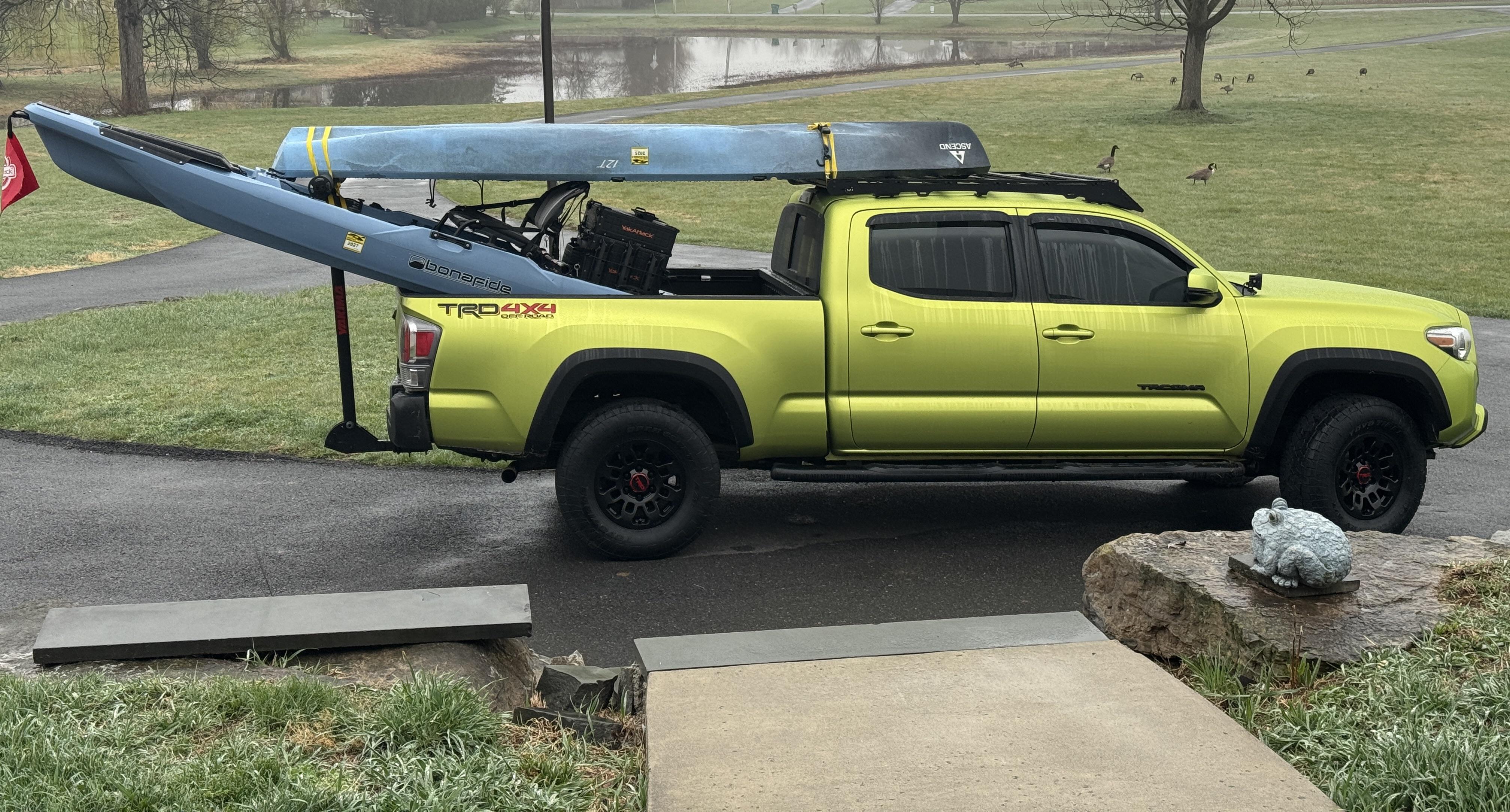 i never understand these. why not put one kayak fully on the roof, and the other in the bed with the gate down/with another extender if you so wish? this just looks aahhhhhh goofy
