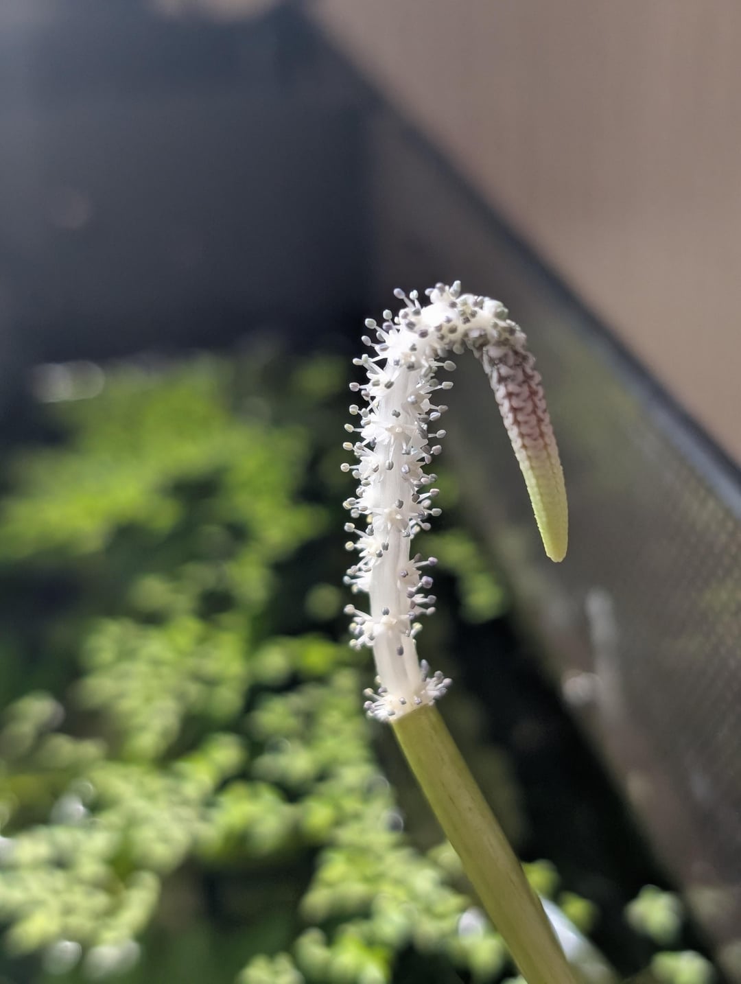 I have a fluval flex freshwater tank white multiple plants, shrimp and fish. I've noticed this weird white plant coming out the top of the water with a big long stem. what is it? should I be concerned?
