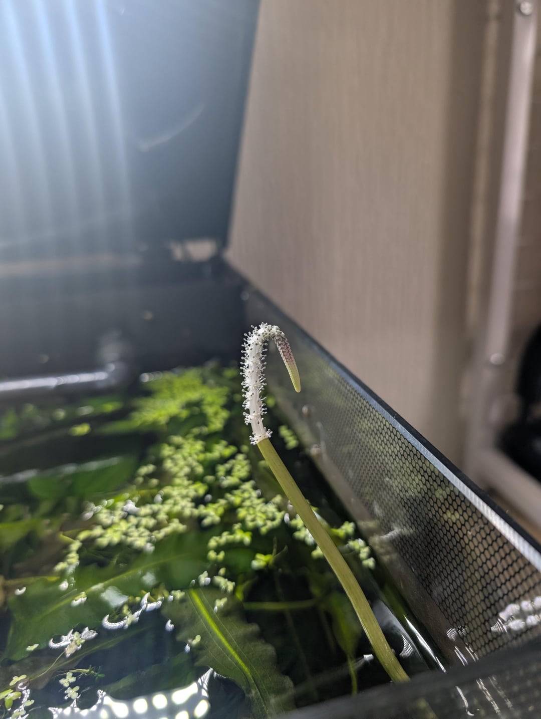 I am guessing at some point you got some Betta Bulbs at Petco or some other version of Aponogeton and it sent up a flower stalk! Mine have been going crazy lately, probably due to the longer days (more indirect sunlight)