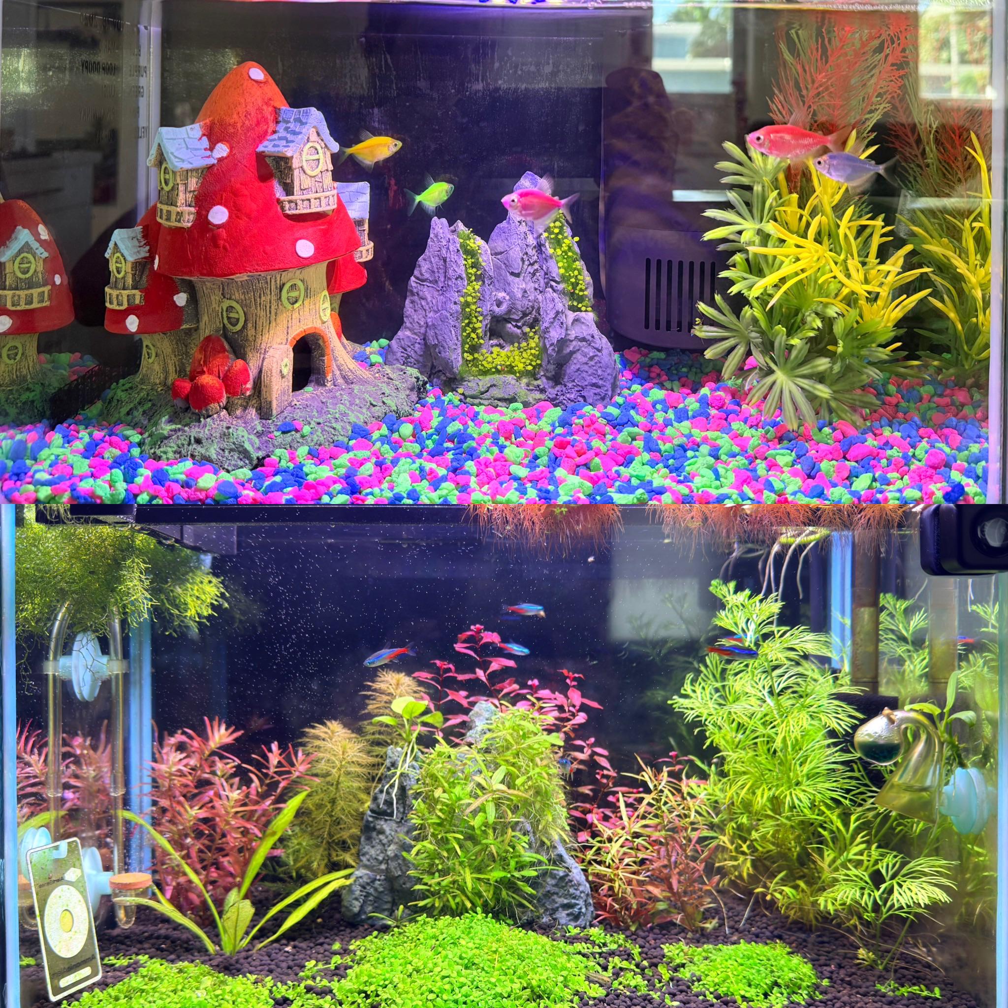 Was gifted a 5 gallon tank with 5 Glofish tetras, glow gravel, plastic plants, mushroom house, and a fake rock with seeds planted on it’s fake moss. I knew NOTHING about this hobby but as soon as I received this gift I started doing some research. Fast forward to today and the tetras were given to an LFS, all the glow gravel, plastic plants, the mushroom house, the in tank filter, and the lid light have been removed. They have been replaced with shrimp, Neon Tetras, Least Killifish, bladder and trumpet snails, Fluval Stratum substrate, real plants, HOB filter, CO2, and a Hygger light. I’ve also dyed the tank silicon a light blue because that’s my favorite color (jk, I had to treat the neons for ich because I got them from an LFS that had them in a pond outside and that dyed all my stuff blue lol). The time between these two pictures is 4 months.