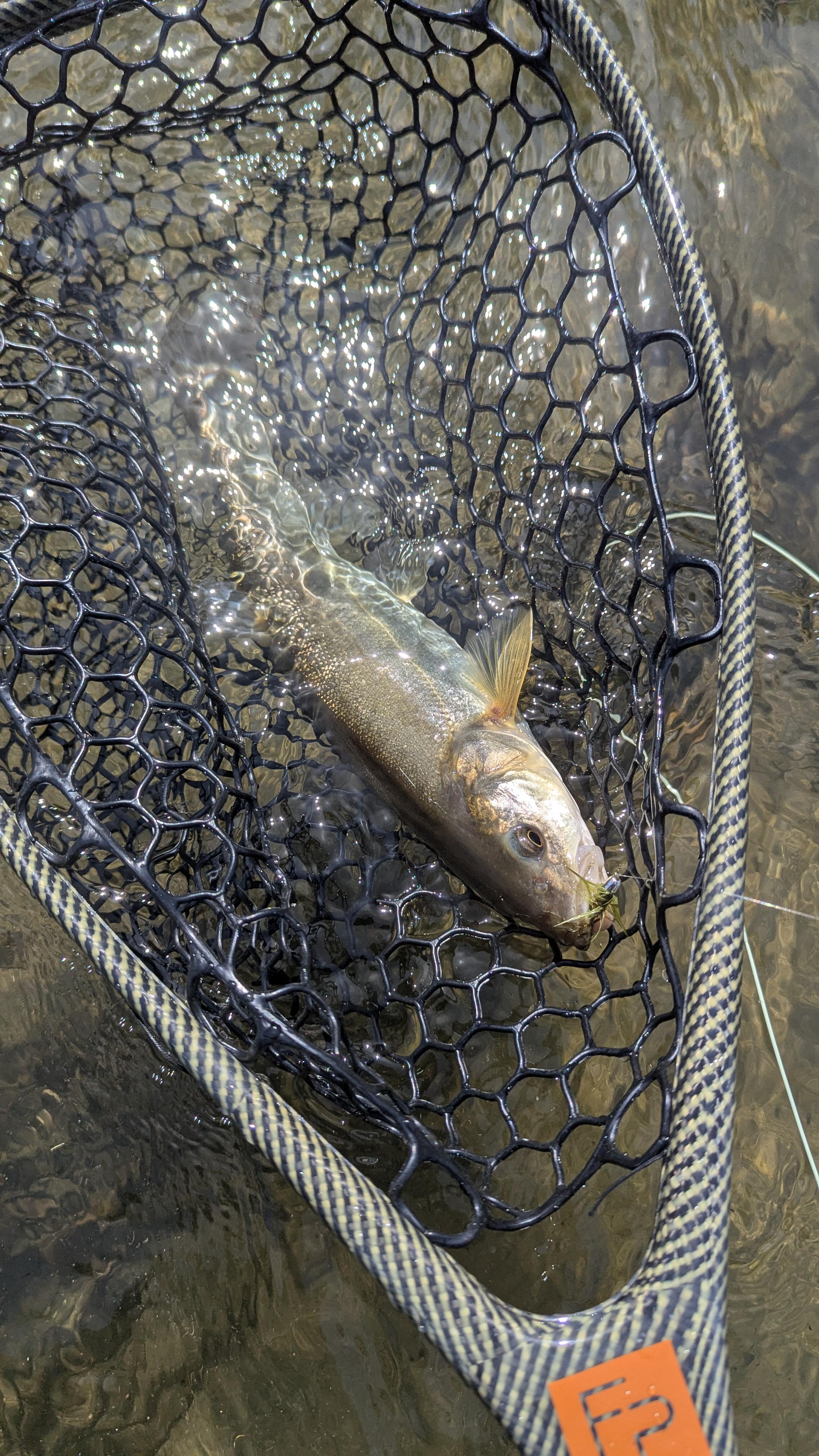 I was so excited I snapped a quick shot with the fly still in but I got it out (barbless) fast and he swam away pretty damn strong after I kept him in the net for a spell. I was so convinced my first few outings would be casting practice I hadn't looked a ton into how to play a fish or best release practice but I hope I did alright.