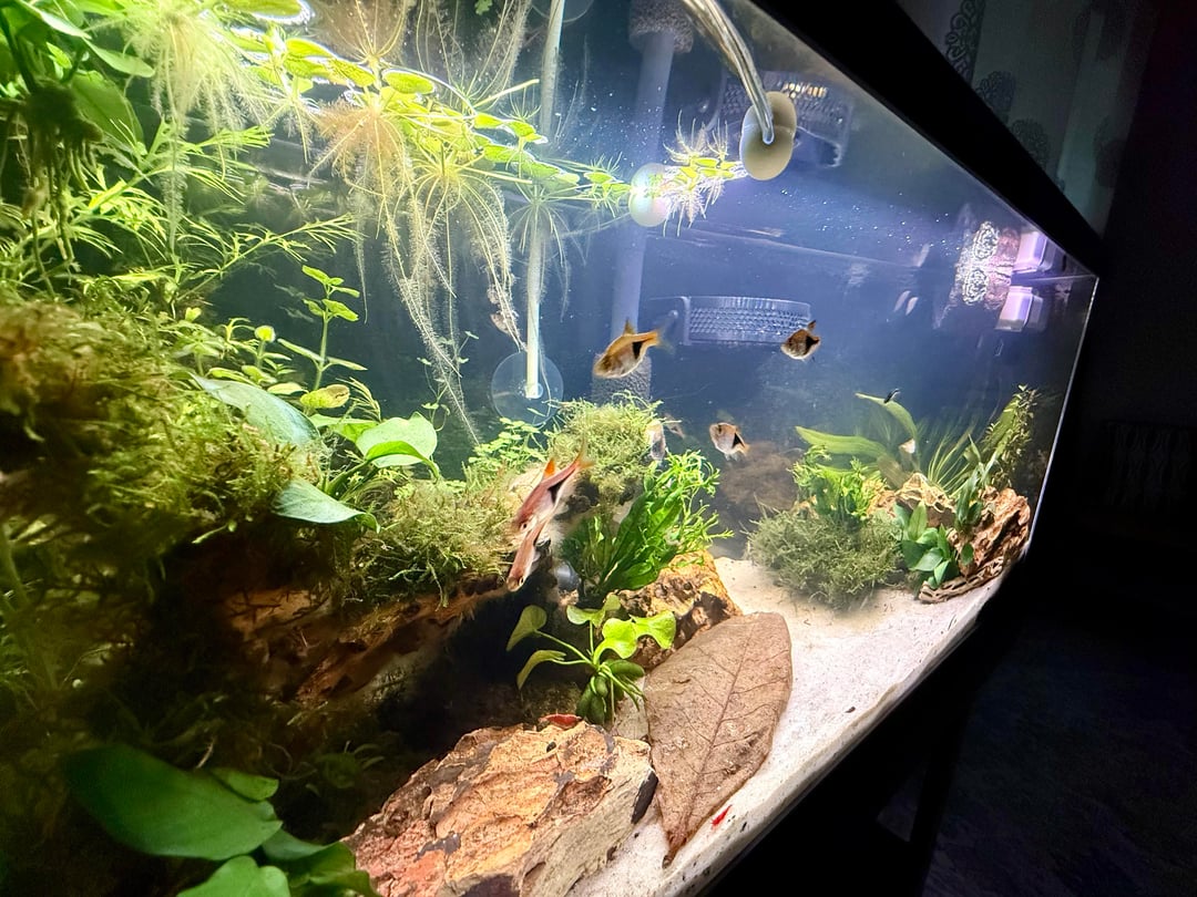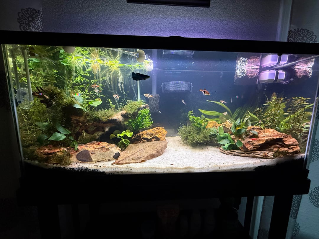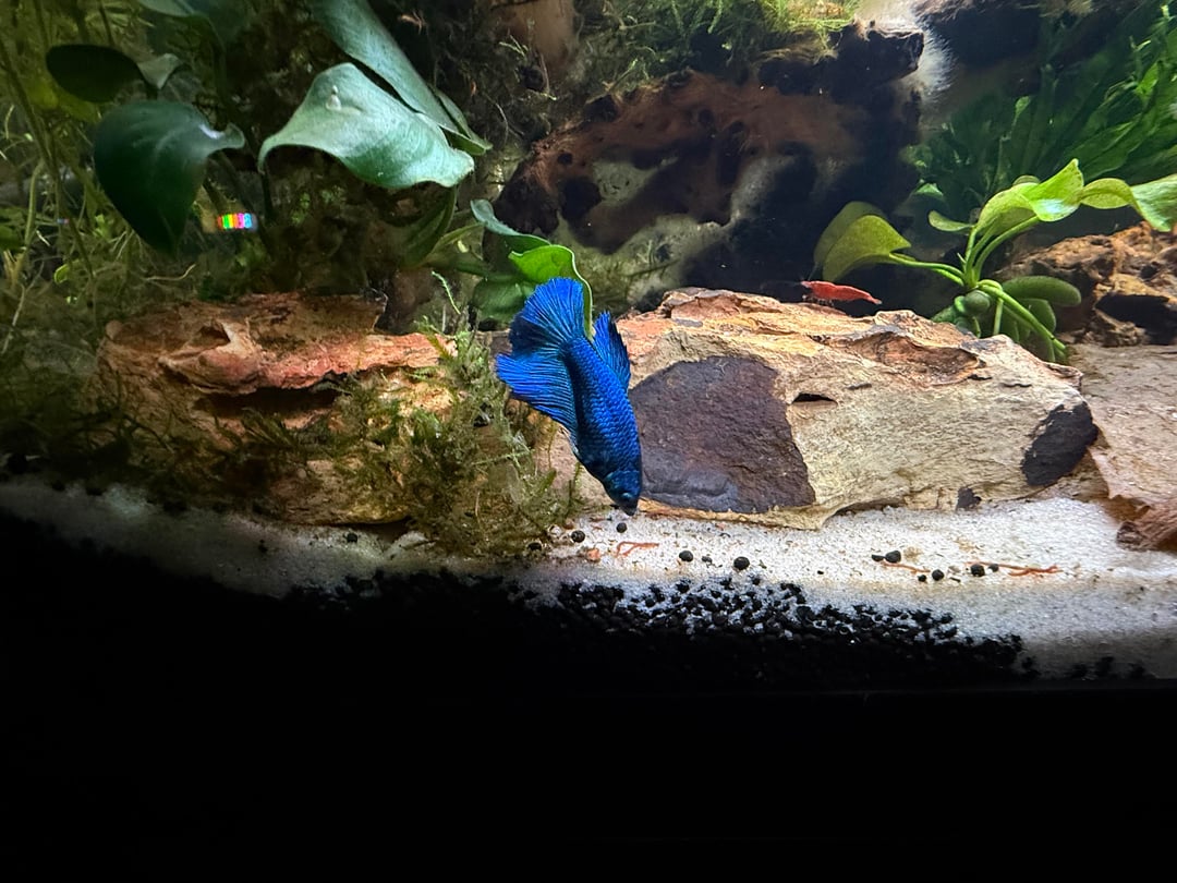 Got this tank up and running over the past few weeks (20 gallon long). Put the betta in today and so far she’s getting along with everyone. There are some Harlequin Rasboras, Pygmy Cories, Cherry Shrimp, and snails in there with her. All live plants of course. It’s fun to be back into the hobby!