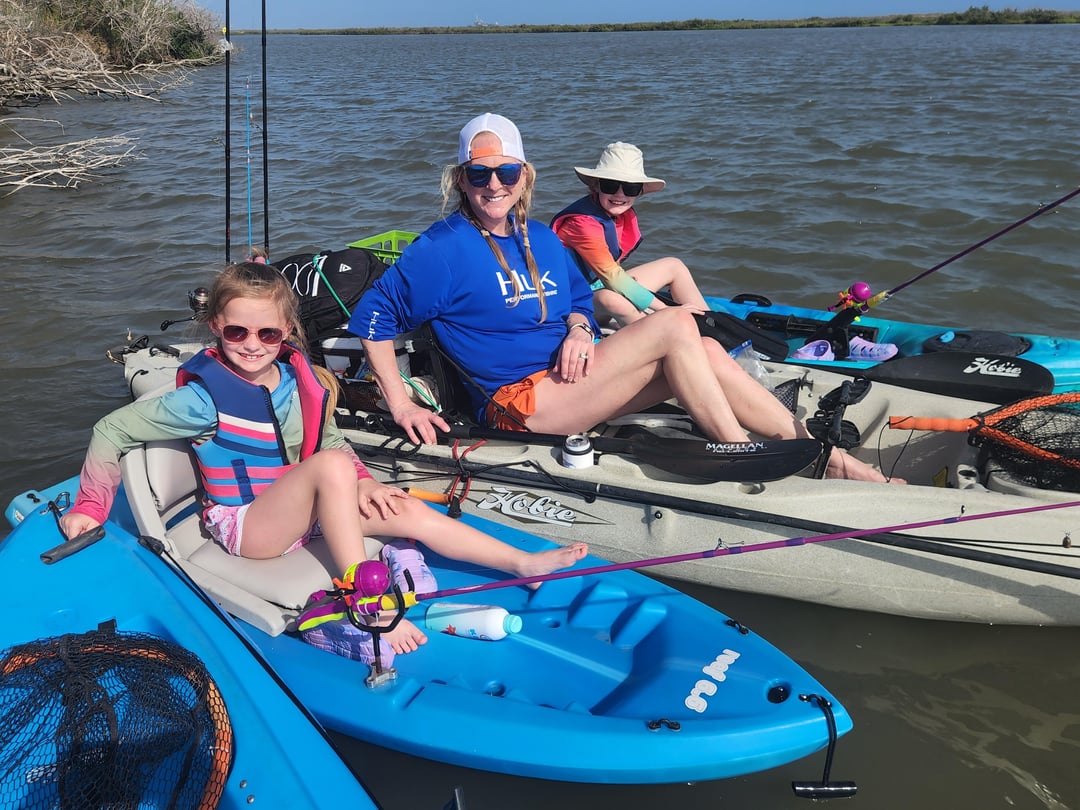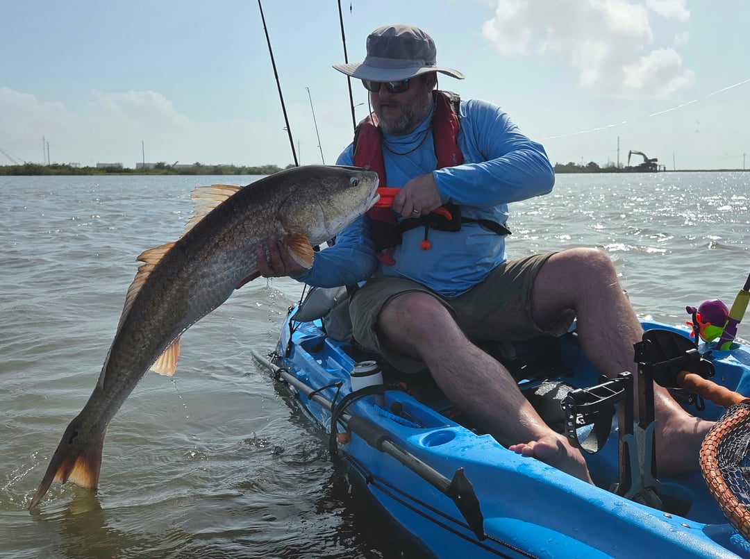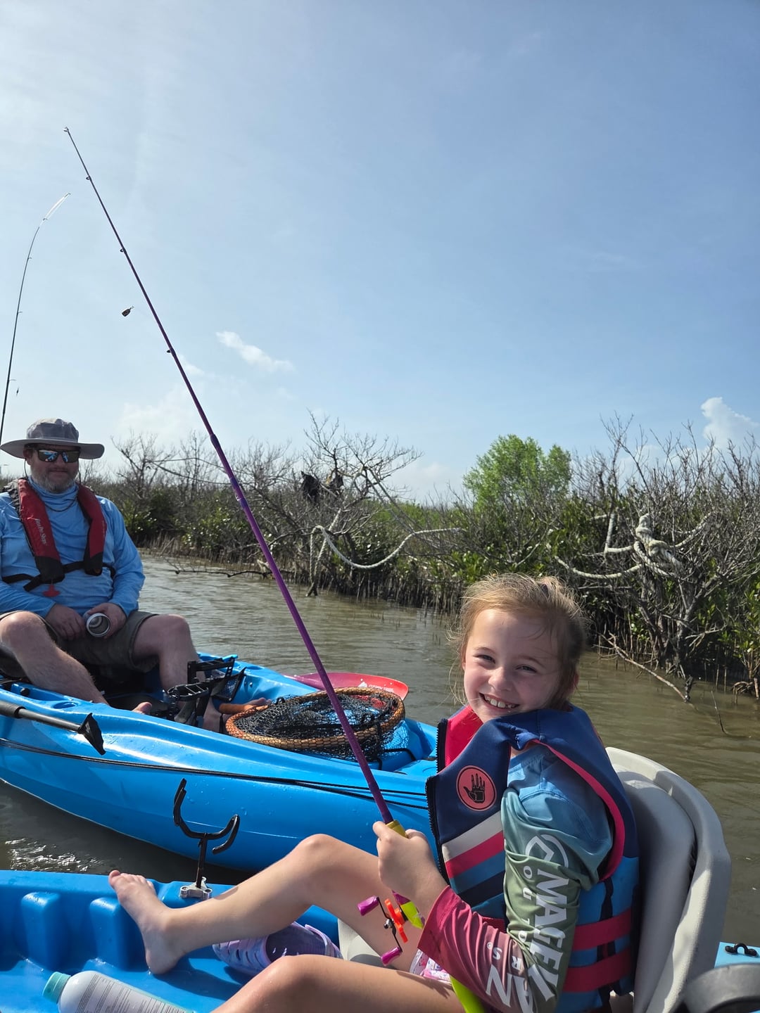 My 8yo hooked into what would be biggest redfish Ive ever seen. My 8yo daughter, on 6.6 Reef kayak, got into a fish using $18 Bass Pro spincast as she is transitioning to 5.5' rod. Amazingly enough she is a lefty using righty reel.