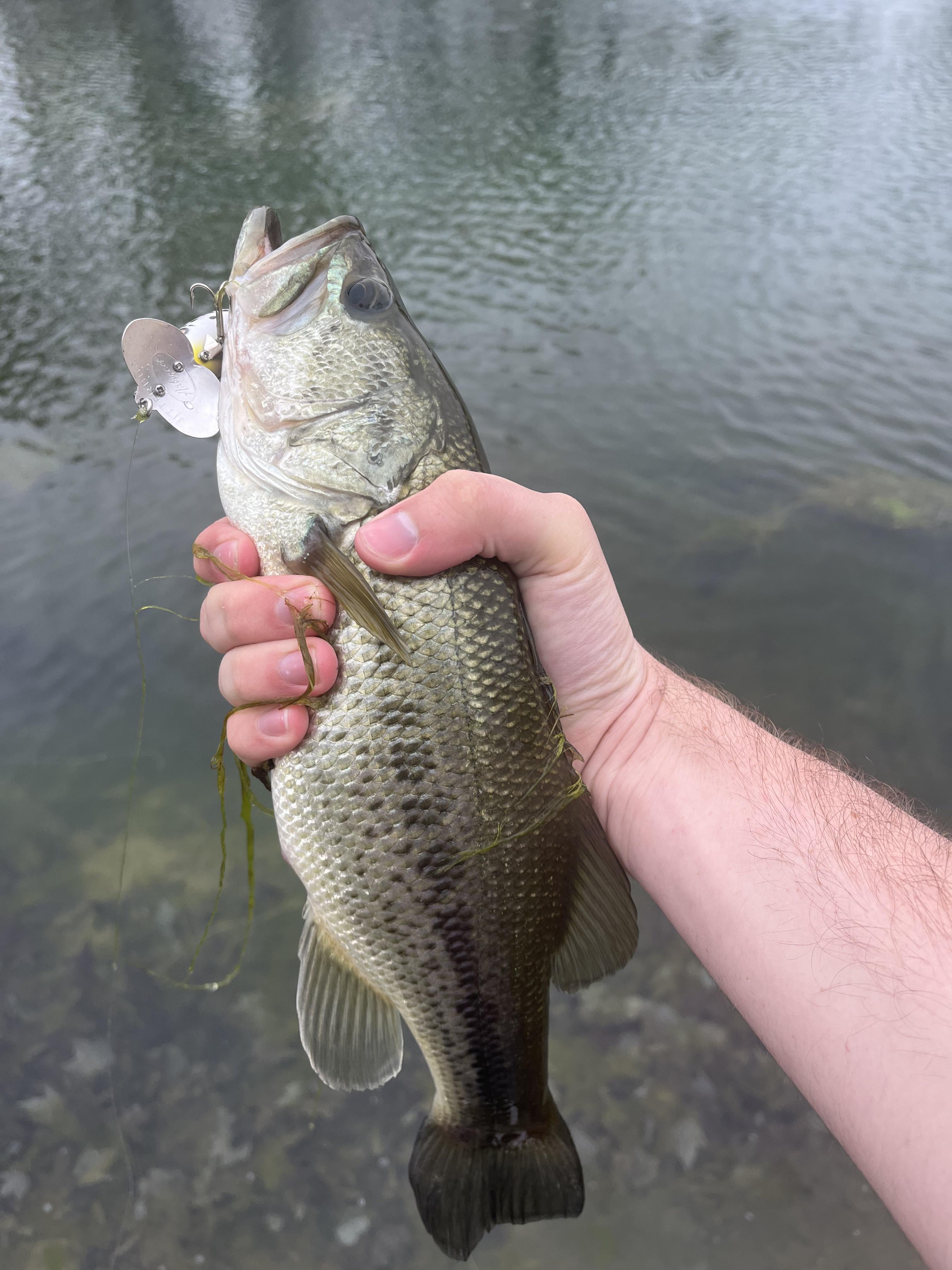 Those frog-colored jitterbugs really work (I didn’t believe it either!!). I just tossed it in the kind of place I expected bass were foraging regularly on small frogs (weedy, shallow areas with enough matting to support small hoppers) and got a furious hit from a bass who seemed very surprised when hooked.