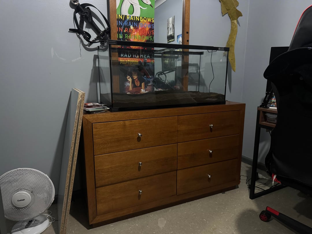 6. The aquarium stand, while likely made of more flimsy material, distributes weight by having support from those center pieces. Your dresser may be better quality wood (I can’t tell by looking at the photo, someone more knowledgeable about it that can comment) but the weight of the centered aquarium is going to be above to least strong points on the dresser. If you can fortify the inside with wood supports and sacrifice the dressers by just wood glue the front panels on so it only looks like a dresser, or use hinges to create small shelves that open from the front without pulling out a drawers, you could diy it fairly inexpensively.