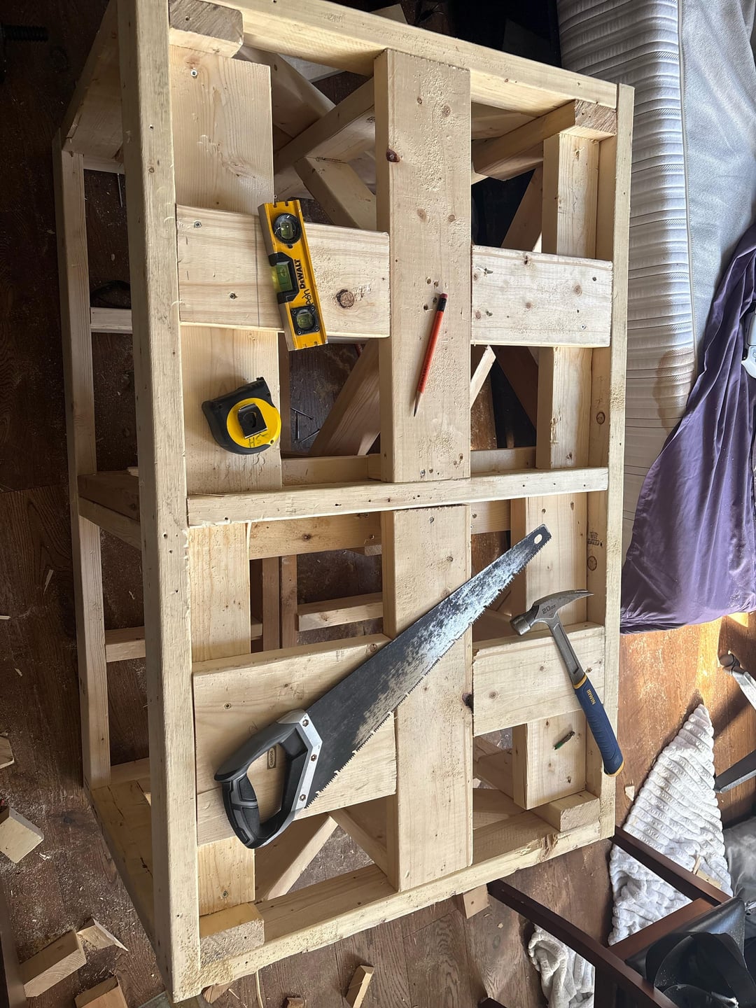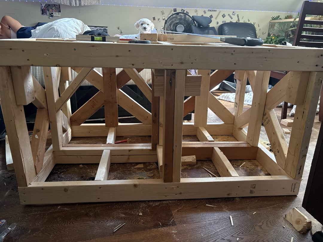 I dont like that your transfer legs aren’t going straight from the tank to floor, and your bracing leaves a little to be desired, but if this is flat and true with no pressure points along the length of the tank anywhere, you should be fine. Strongly suggest a nice 3/4″ cabinet grade plywood top and give the whole thing a good seal with some Killz and paint to color choice.