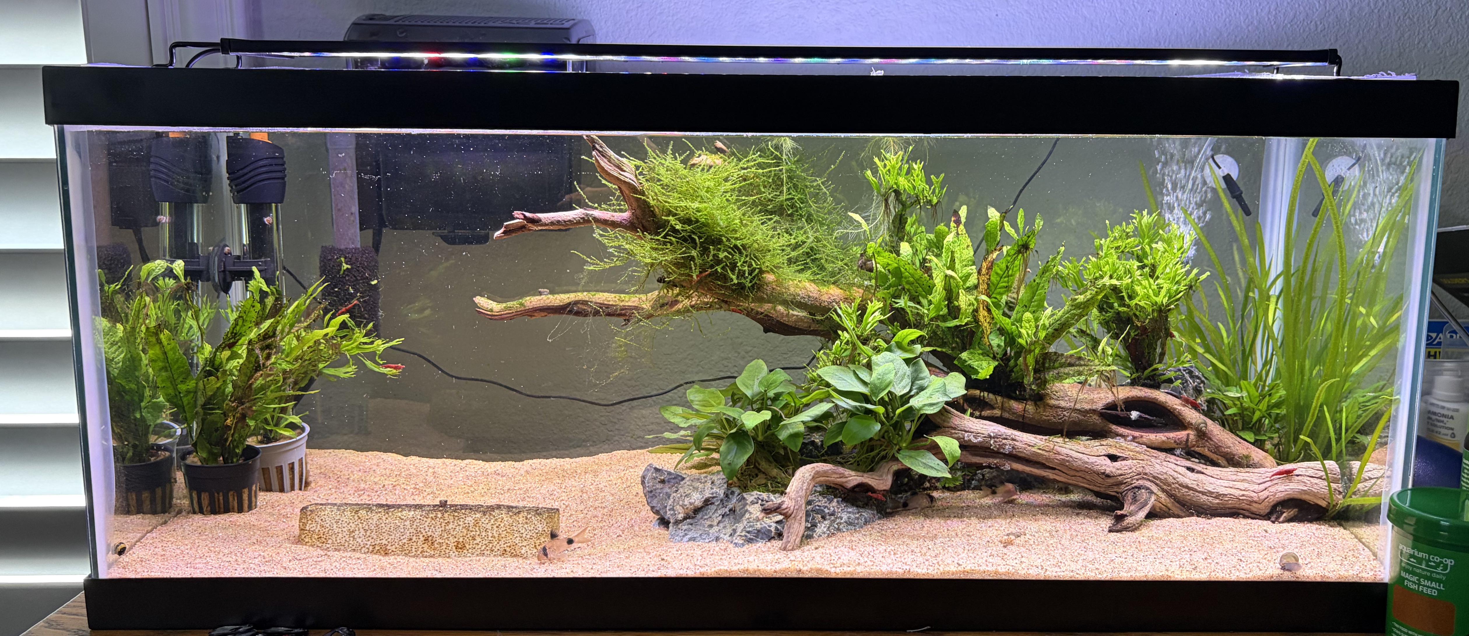 Current inhabitants: 12 ember tetras, 7 panda Cory’s and 1 baby BN pleco and a few mixed cherry shrimp + 1 Amano . I do know that betas and gouramis may eat shrimps however, i am not worried due to this being an old pic and things are way more grown in.
