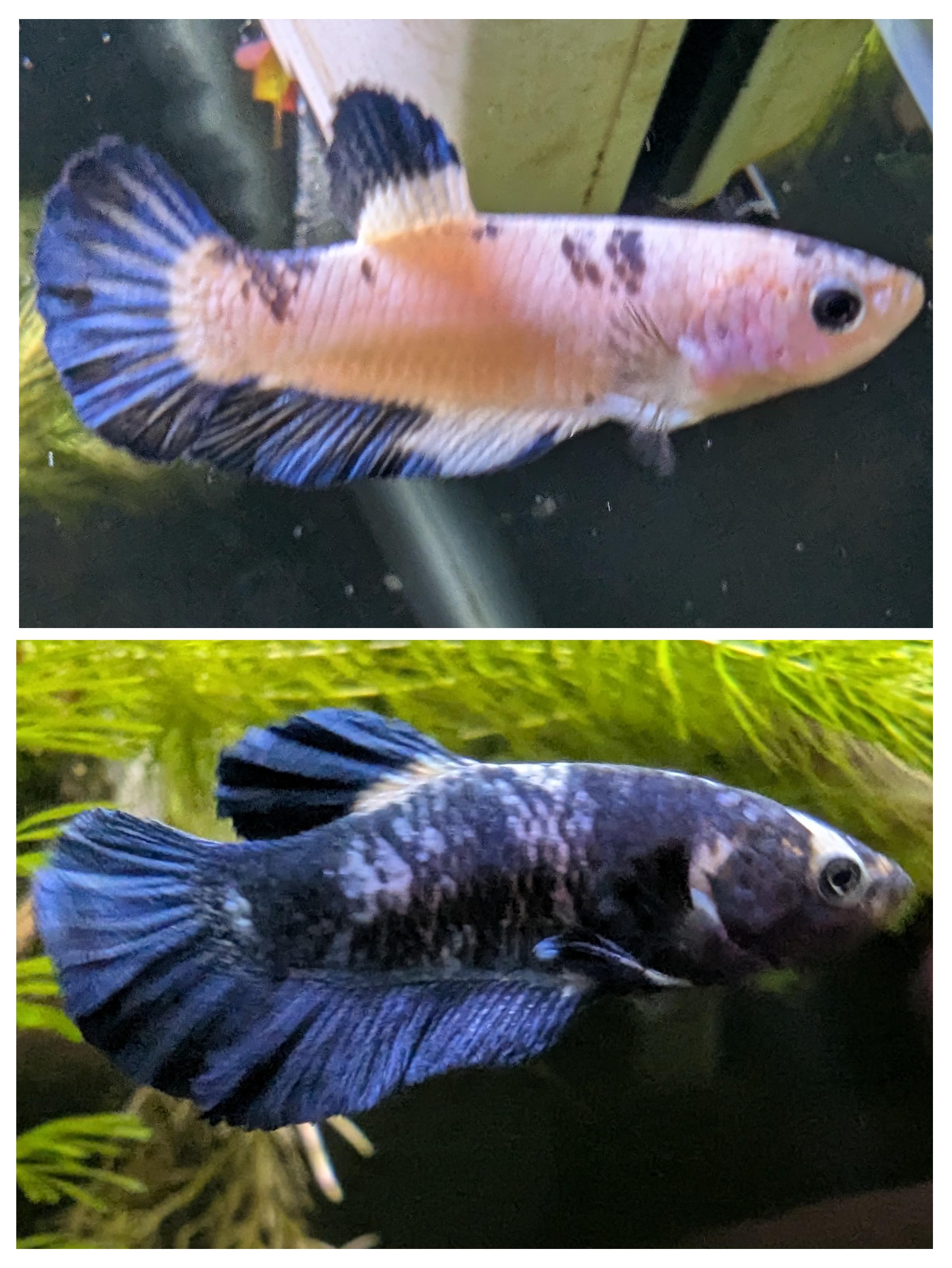 Betta Fish: Obligatory 1-month glowup photo of my betta “Not Sure”… Sold as a Male Blue Marble. I’m assuming Plakat 🤷