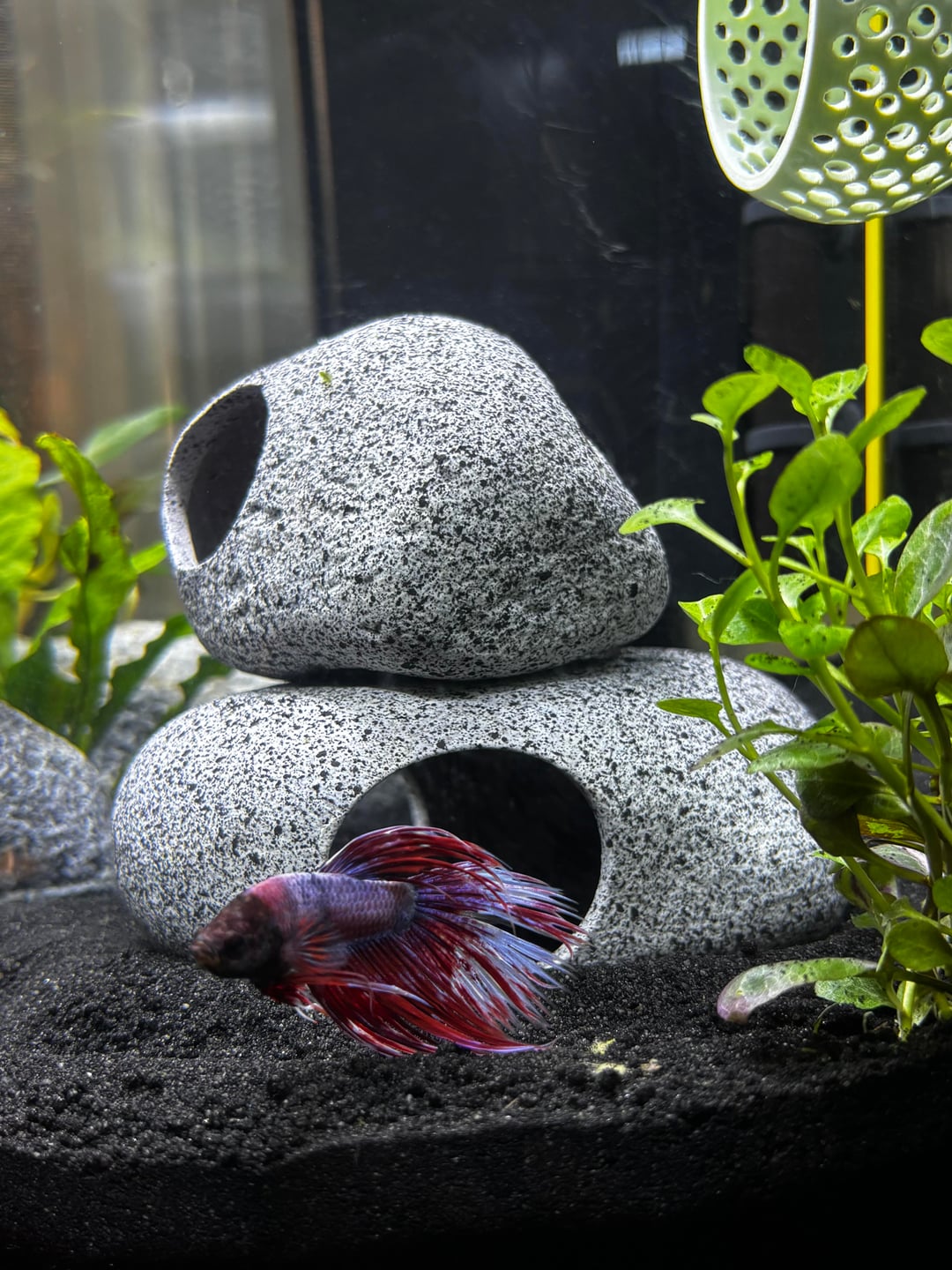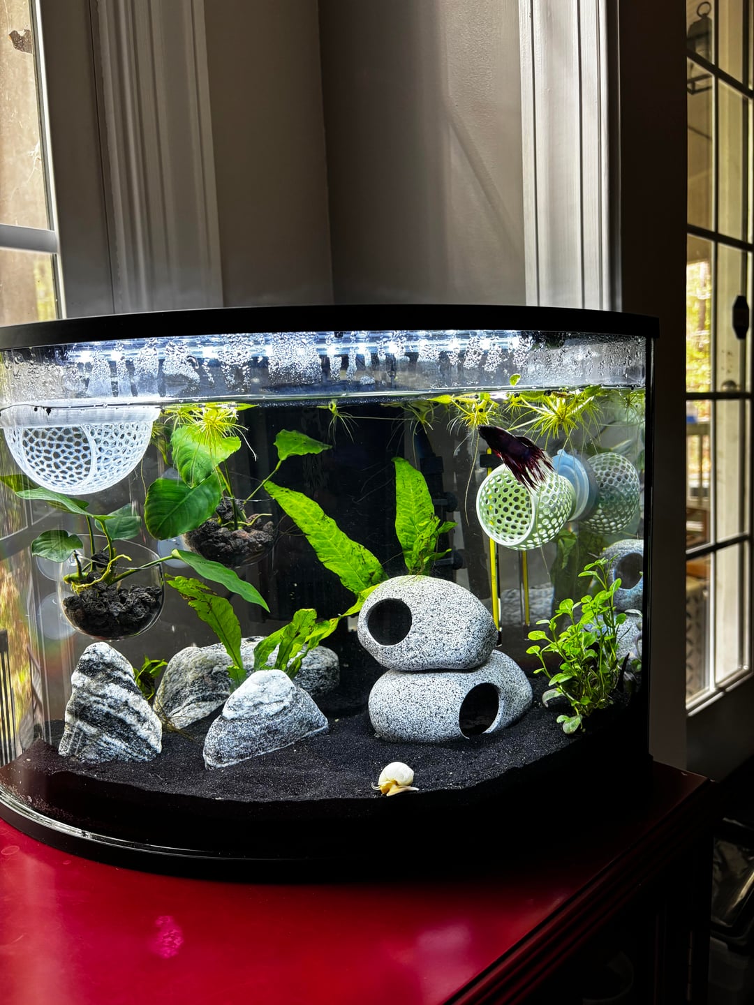 You are welcome to rate it as well. It’s a six gallon corner style tank. I probably got my fish early but he is doing great. I also have a mystery snail which I find entertaining and a nerite snail who escaped once. He hangs out above the water. I don’t think he’s happy and I don’t know why. My fish is a crown tail (Mr. Fins) and he seems to be a happy and healthy fish.
