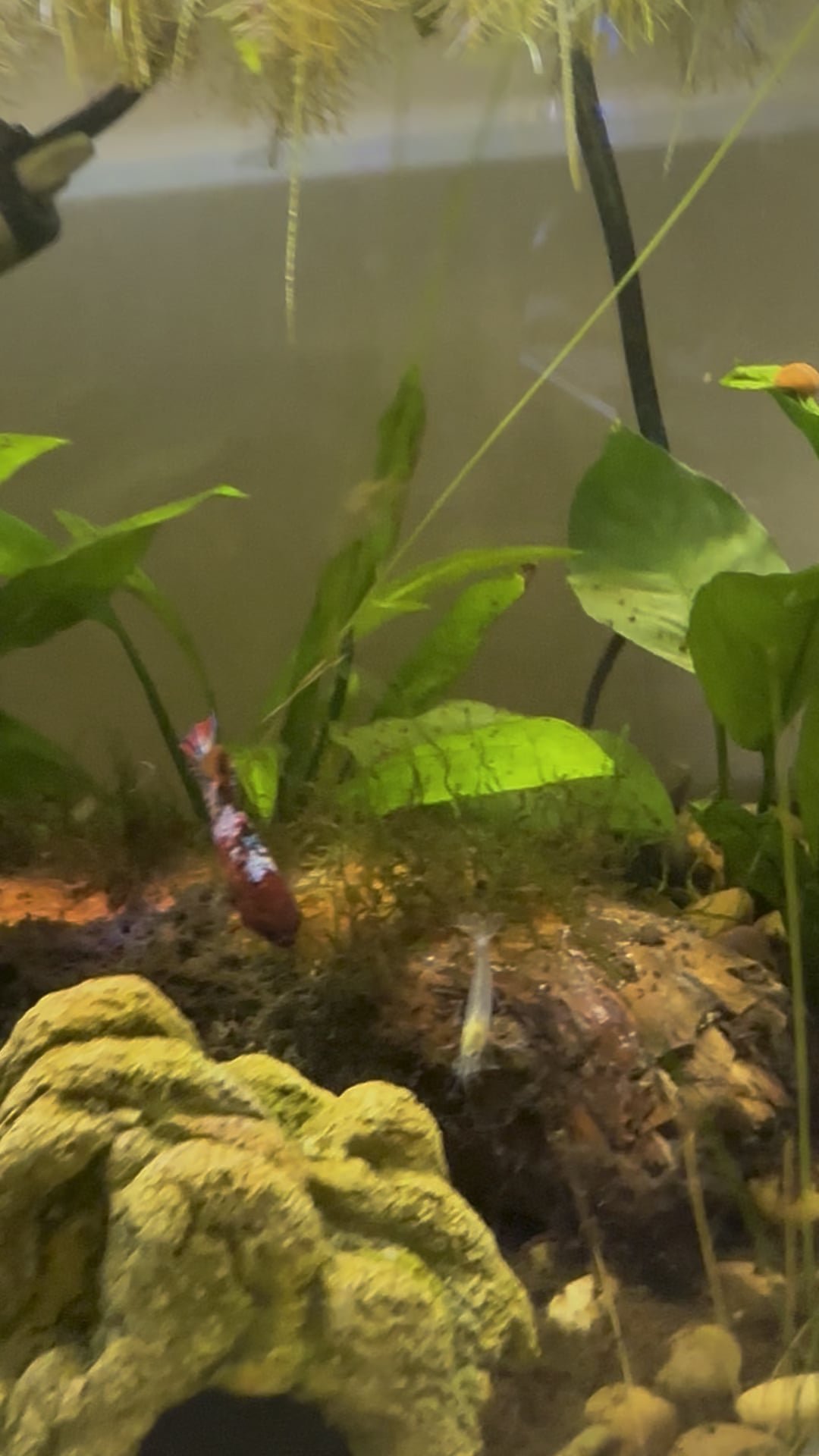 Anyways here she is finally in her CYCLED 10 gallon tank, meeting an amano shrimp for the first time. Was very worried she was going to attack them so we let the amano live in the tank for 3 weeks before adding flora. 🤞