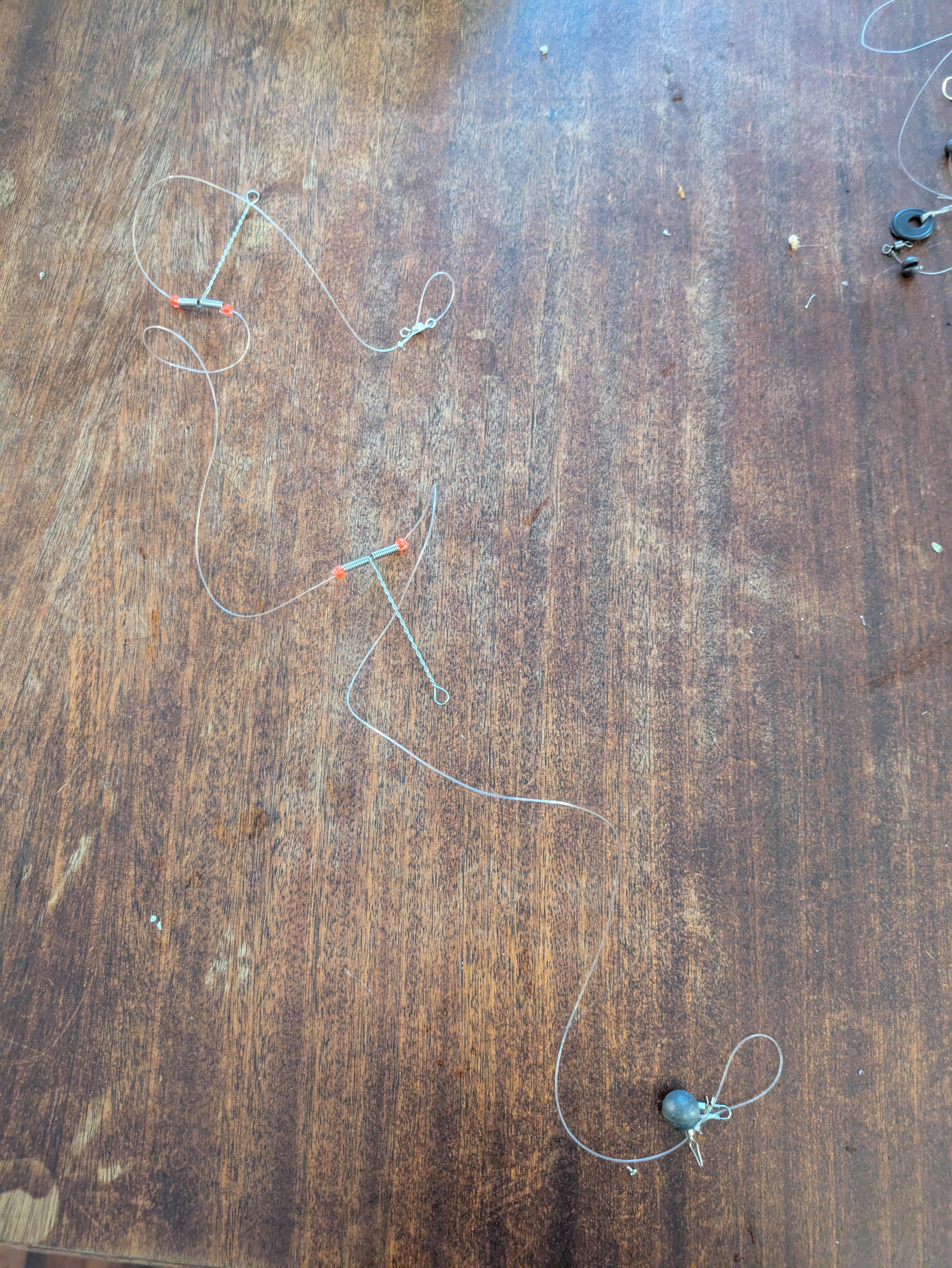 i kinda figure this is for a multi hook sort of drop rig, i believe it might be for bluegill and other sunfish. the 2 ends are looped, and 1 loop has a swivel on. so assume the swivel attaches to my line, and then i tie on a piece of line to the long end of each of the T things. then a sinker on the bottom loop? assuming it should be used with a bobber, and put worms on the 2 lines off the T's? put a 3rd hook with 1 or 2 of those crimp-on on ball weights around the bottom loop?