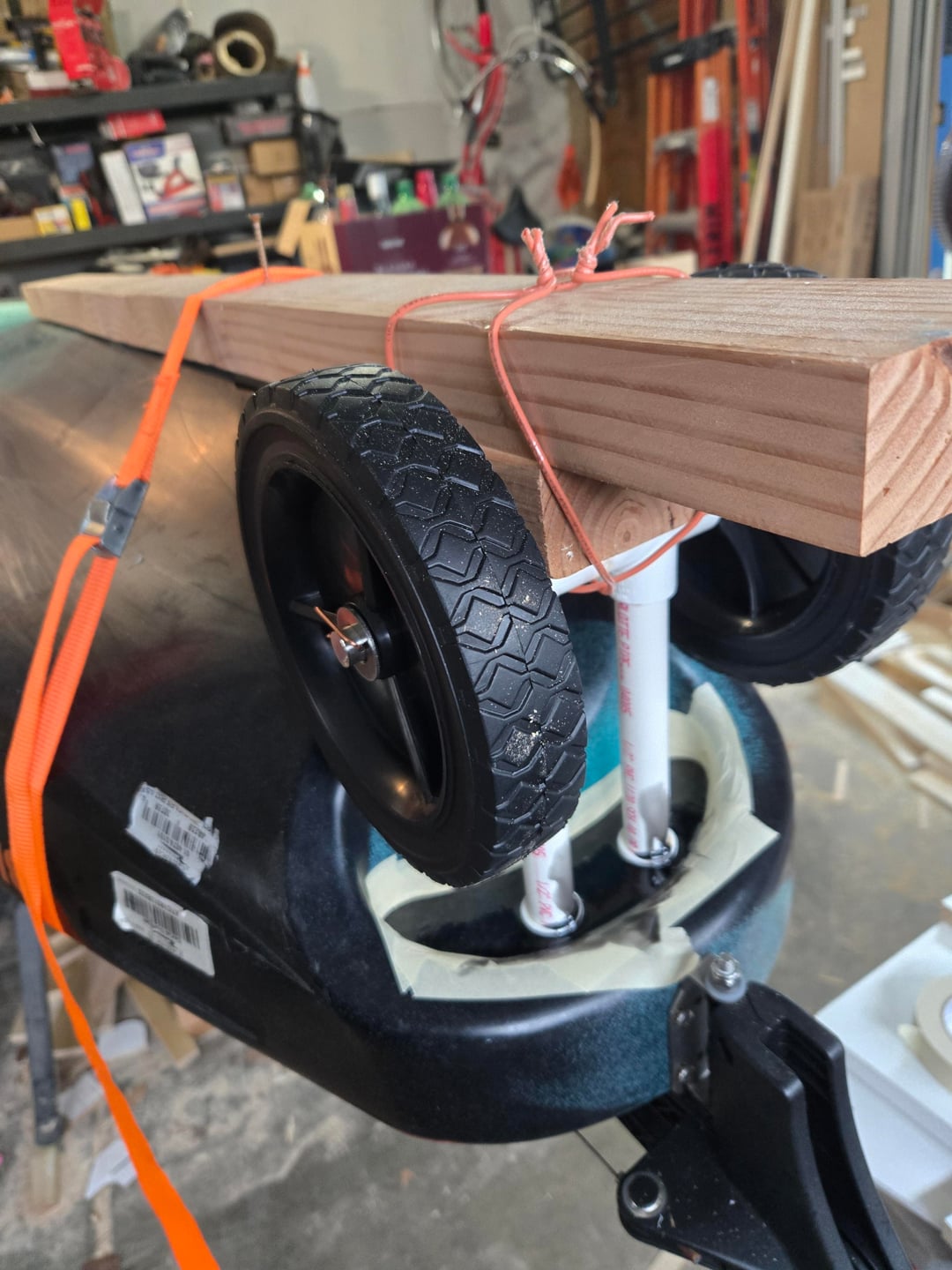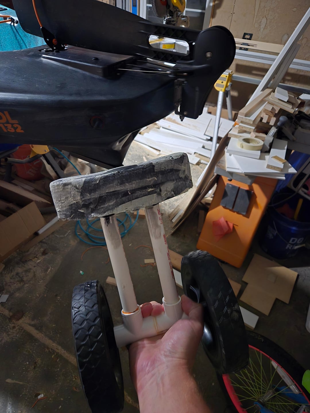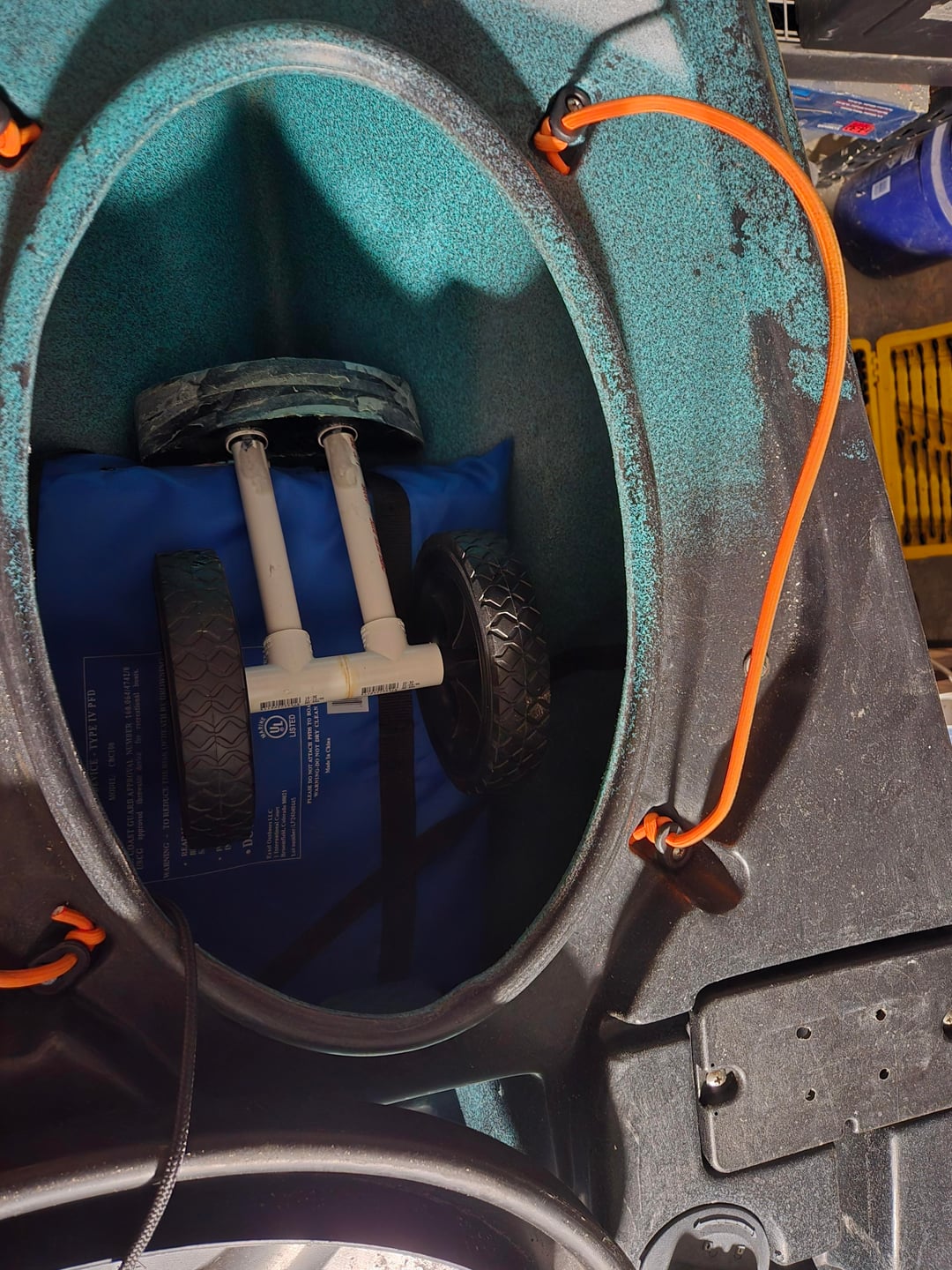 It probably sounds stupid, but I never liked how a cart or any kind of wheels look on a kayak once it is already in the water. When I saw the rear 'handle' on the Bigwater 132 I figured I can take a shot at making my own compact wheel attachment that can easily fit in the front hatch afer use. I havent used it yet, so cant say how well it rolls. Sorry about the mess in my garage, Im always working on something around the house and its just impossible to keep it clean.