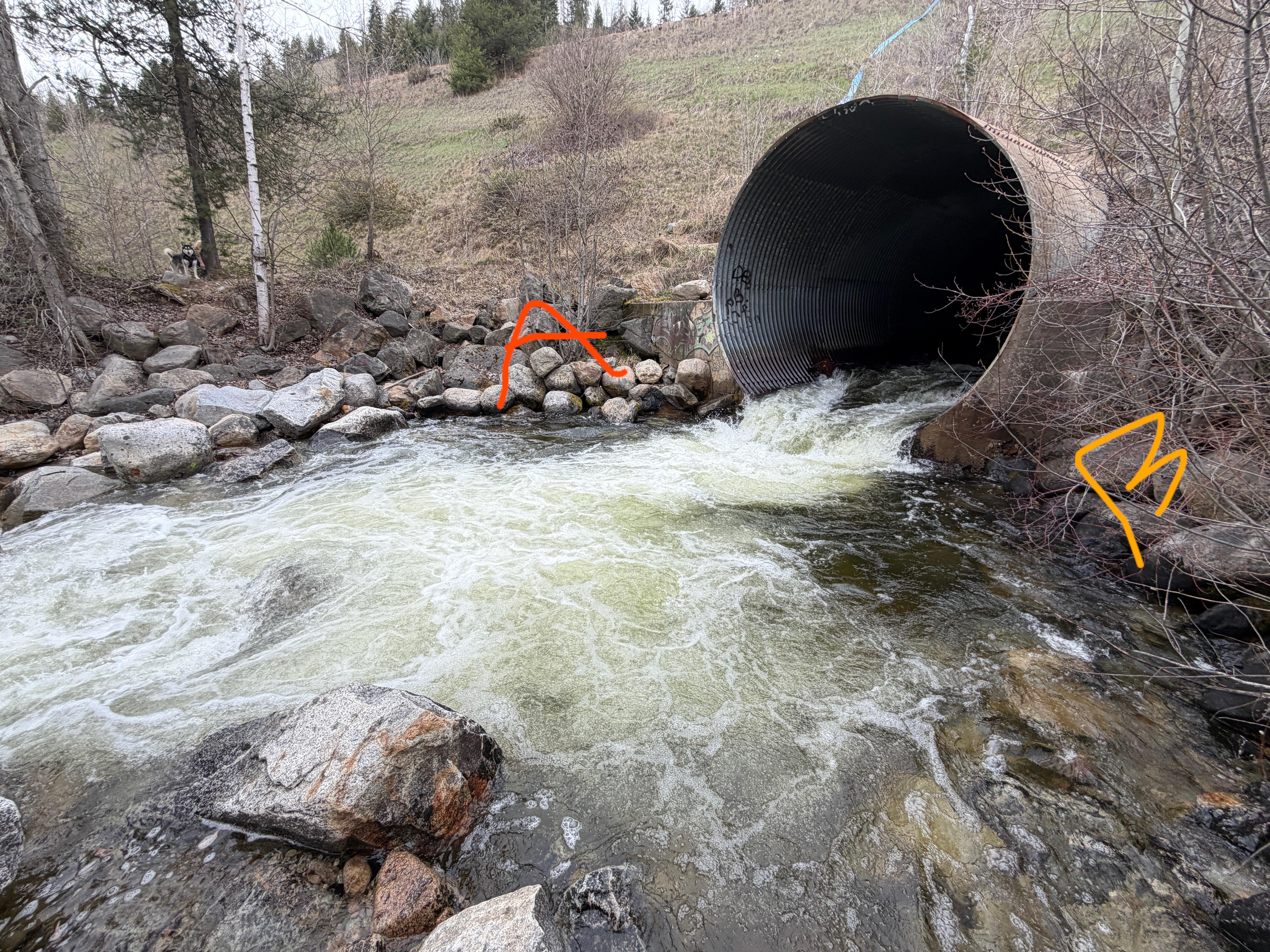 My idea is stand at the angle the photo is taken. Then cast a fly at the entrance of the culvert, and let the current drag it like a regular bug would be. The fish will see this as a free lunch.