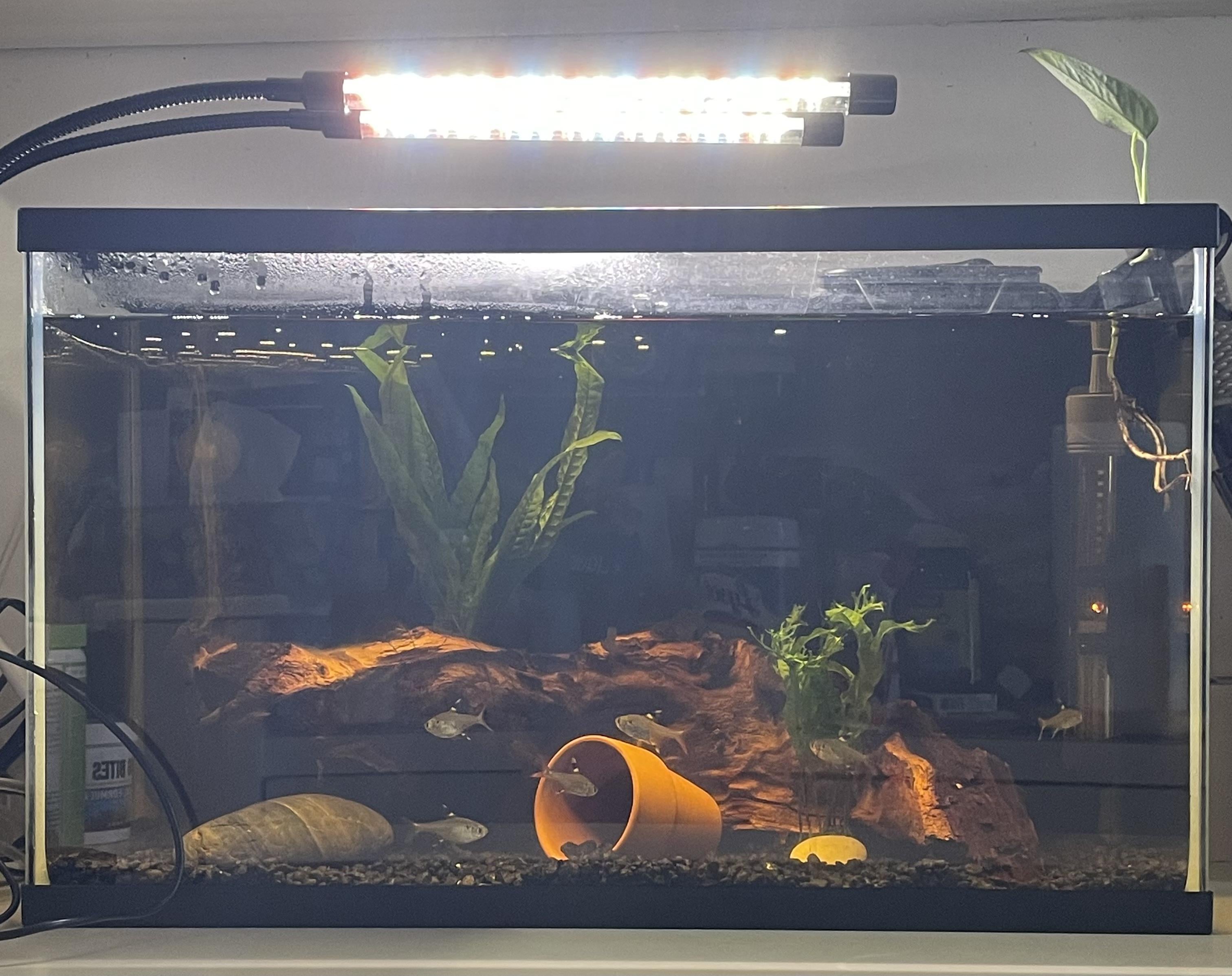 I wouldn’t recommend a centerpiece in this 10g setup with 7 tetras occupying mid column- maybe a dwarf white spotted pleco or some sort that occupies the bottom (garra or a loach) could work.