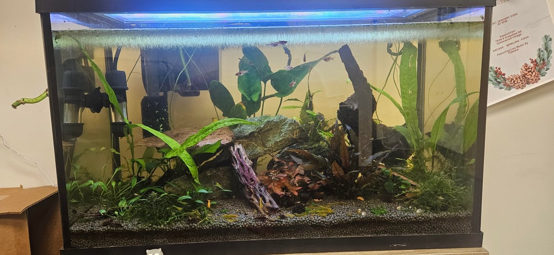 If any of you are in the Western US you may have heard about the parking garage that collapsed in Denver. That garage was my at my office building. My coworker is one of the few cars that was crushed, mine was trapped in the basement for a week and a half. What does all this have to do with fish? Well I have an office aquarium, which I was unable to check on for 2 weeks till the building was confirmed to be safe. I was beside myself with worry for my aquarium. Its stocked with Neocaridina and Chili Rasboras. I knew the shrimp would be fine, but my rasboras!