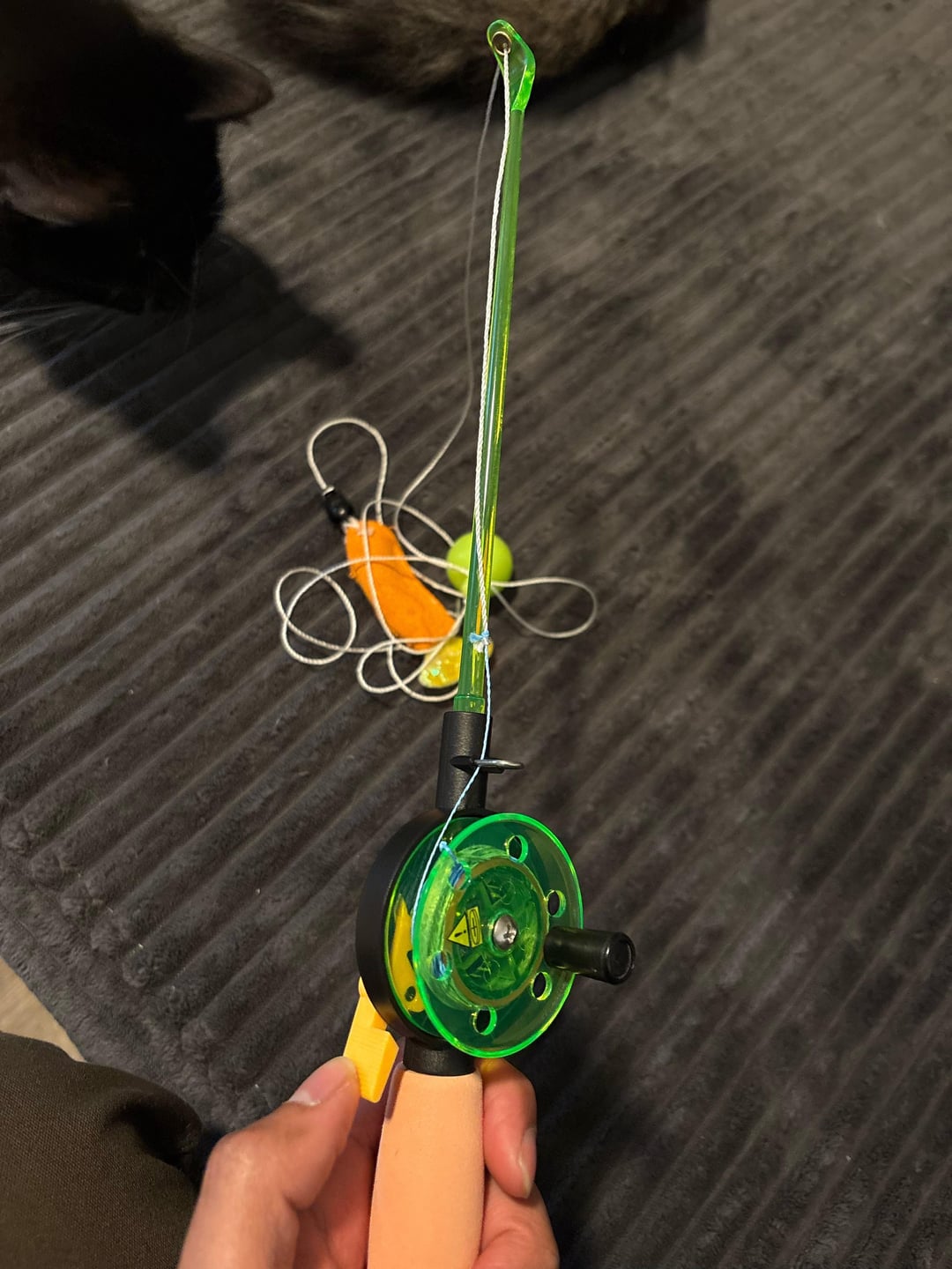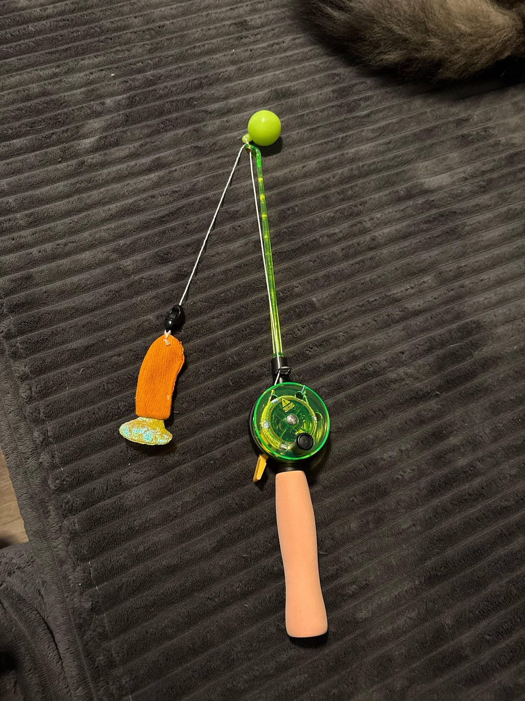 The end has a fabric fake fish and about 6” up the line it has a rubber ball acting as a weight. The lever my thumb is on locks the spool. I tied the braided line to the end of the original string.