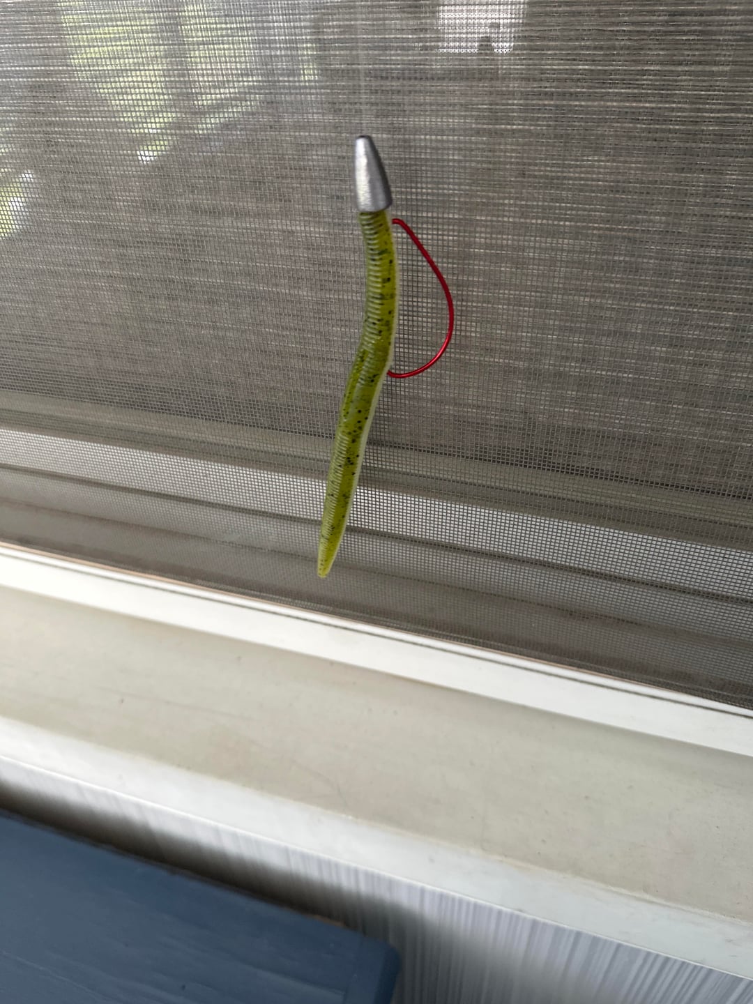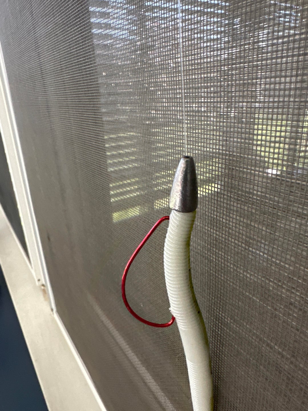Spug33 on April 8, 2026 7:02 pm Go all the way through the worm and then just hook it back in a bit on the other side. An offset hook helps it lay right. Also that weight maybe looks a bit big. I don’t even use a weight most of the time and let it sink slowly while twitching.