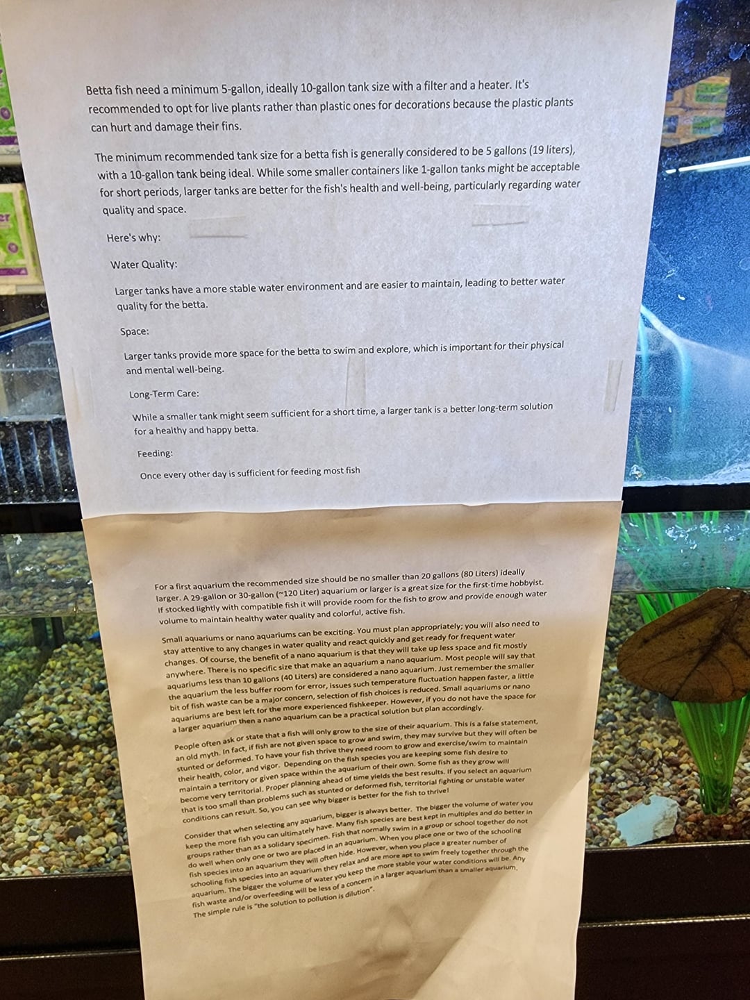 If you're Canadian, you've probably heard of Mr. Pets (it's like Petsmart though we have those too, there's a Mr. Pets in every major city etc). Today I went to check the betta section at the store in my city and was pleasantly surprised to see their tank set up looking pretty amazing. The best part was that there's a huge print out stuck to the side of the display which explains to people that bettas need at least 5 gallon tanks! Thought that was cool.