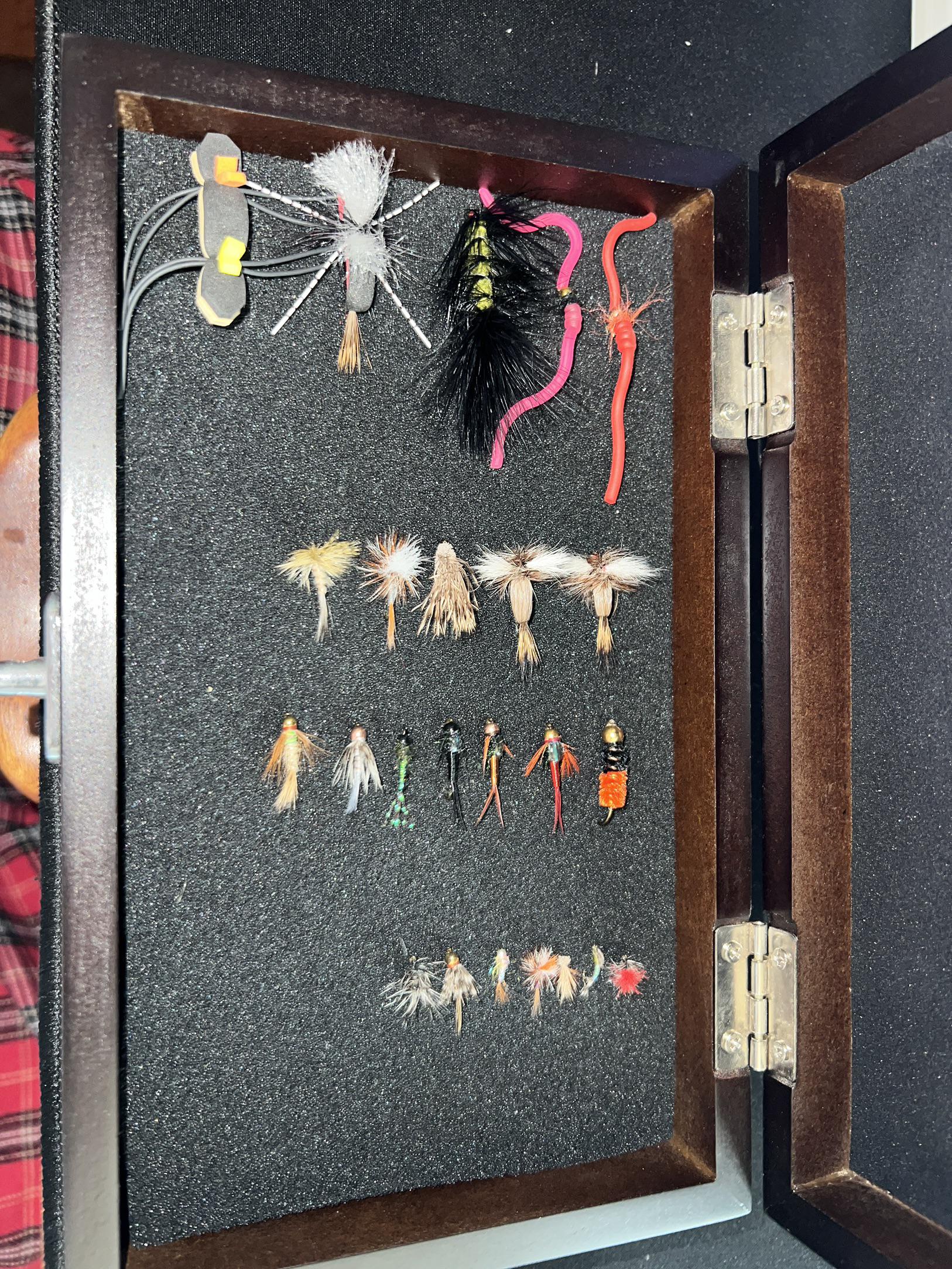 Top row: chubby (imitates stoneflies and grasshoppers), Wooly bugger (great streamer), squirmy worms (also great ‘confidence’ fly) everything else is assorted nymphs and dry flies
